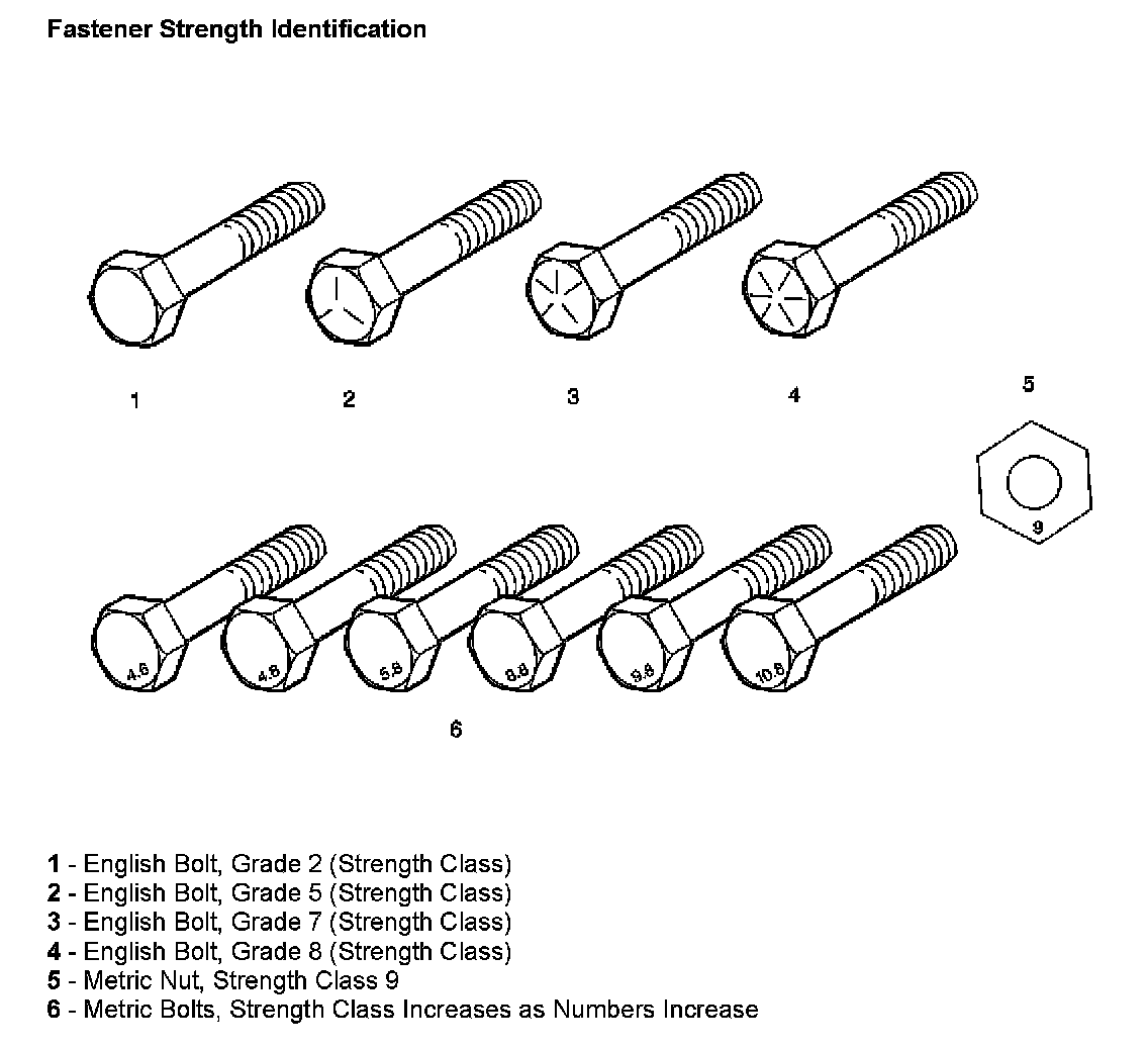 The most commonly used metric fastener strength property classes are 9.8 and 10.9. The class identification is embossed on the head of each bolt. The English, inch strength classes range from grade 2 to grade 8. Radial lines are embossed on the head of each bolt in order to identify the strength class. The number of lines on the head of the bolt is 2 lines less than the actual grade. For example, a grade 8 bolt will have 6 radial lines on the bolt head. Some metric nuts are marked with a single digit strength identification number on the nut face.