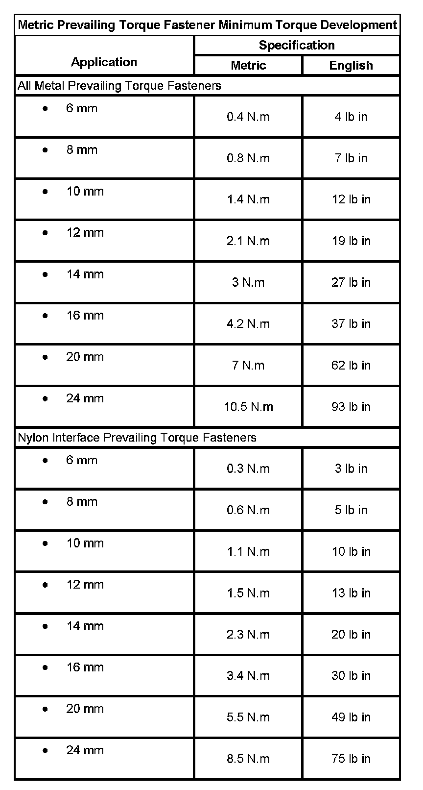 METRIC PREVAILING TORQUE FASTENER MINIMUM TORQUE DEVELOPMENT