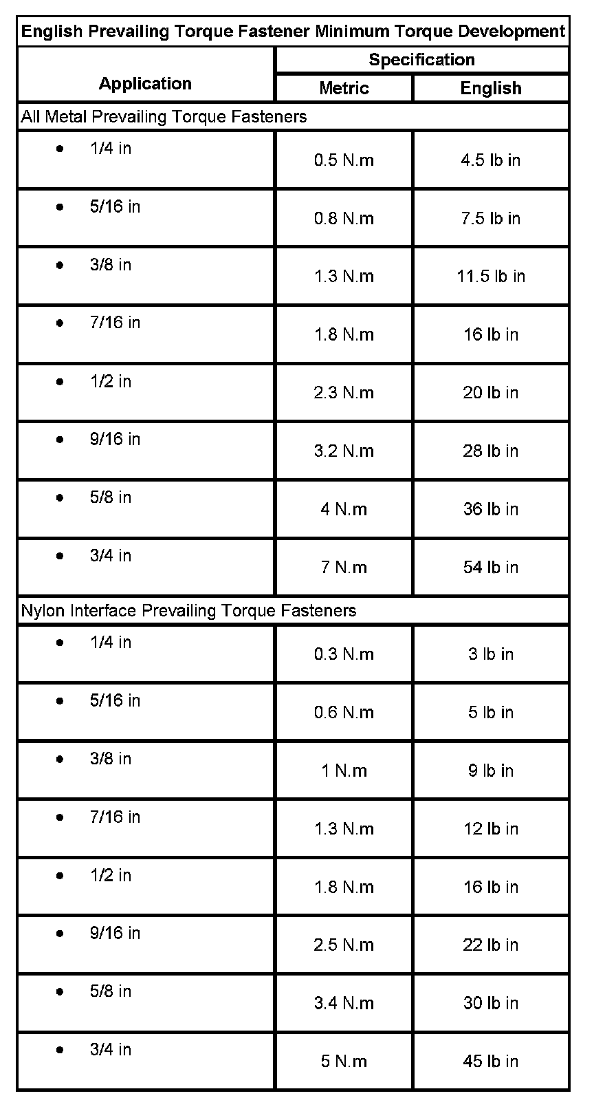 ENGLISH PREVAILING TORQUE FASTENER MINIMUM TORQUE DEVELOPMENT