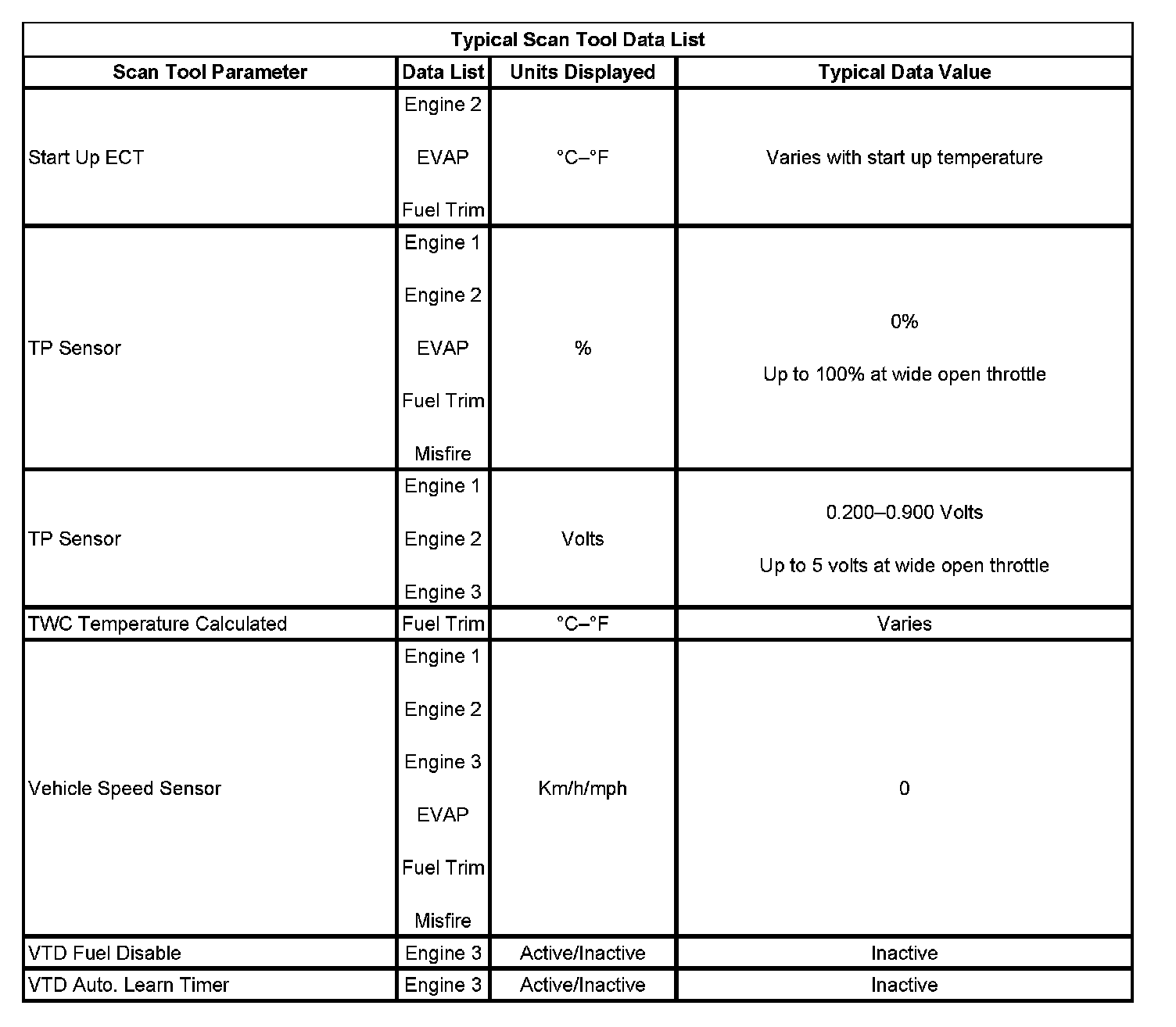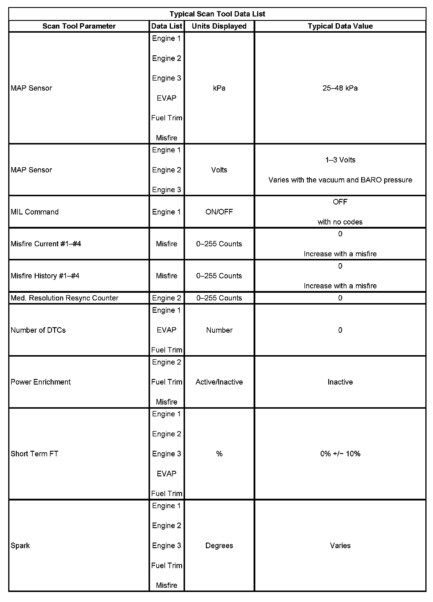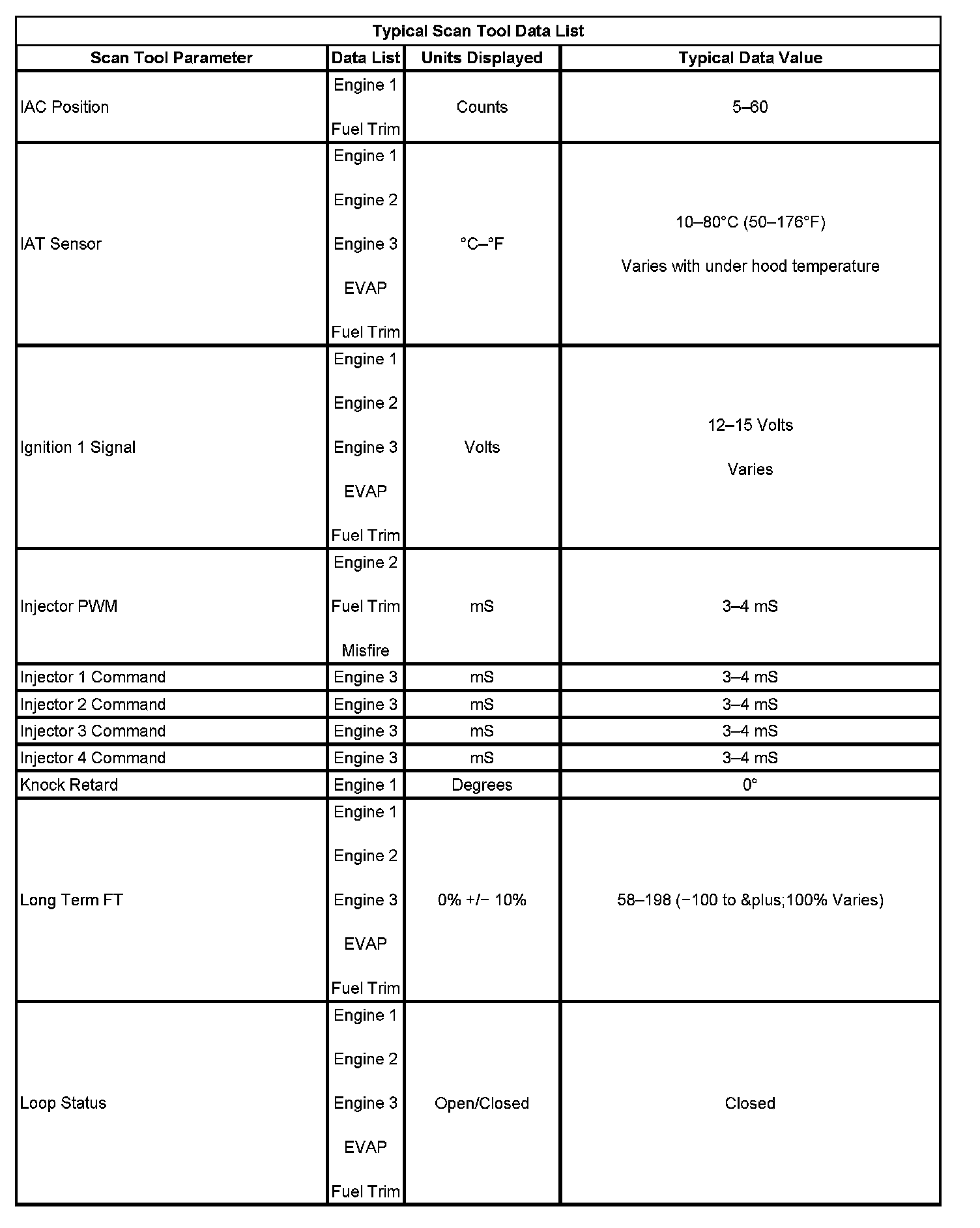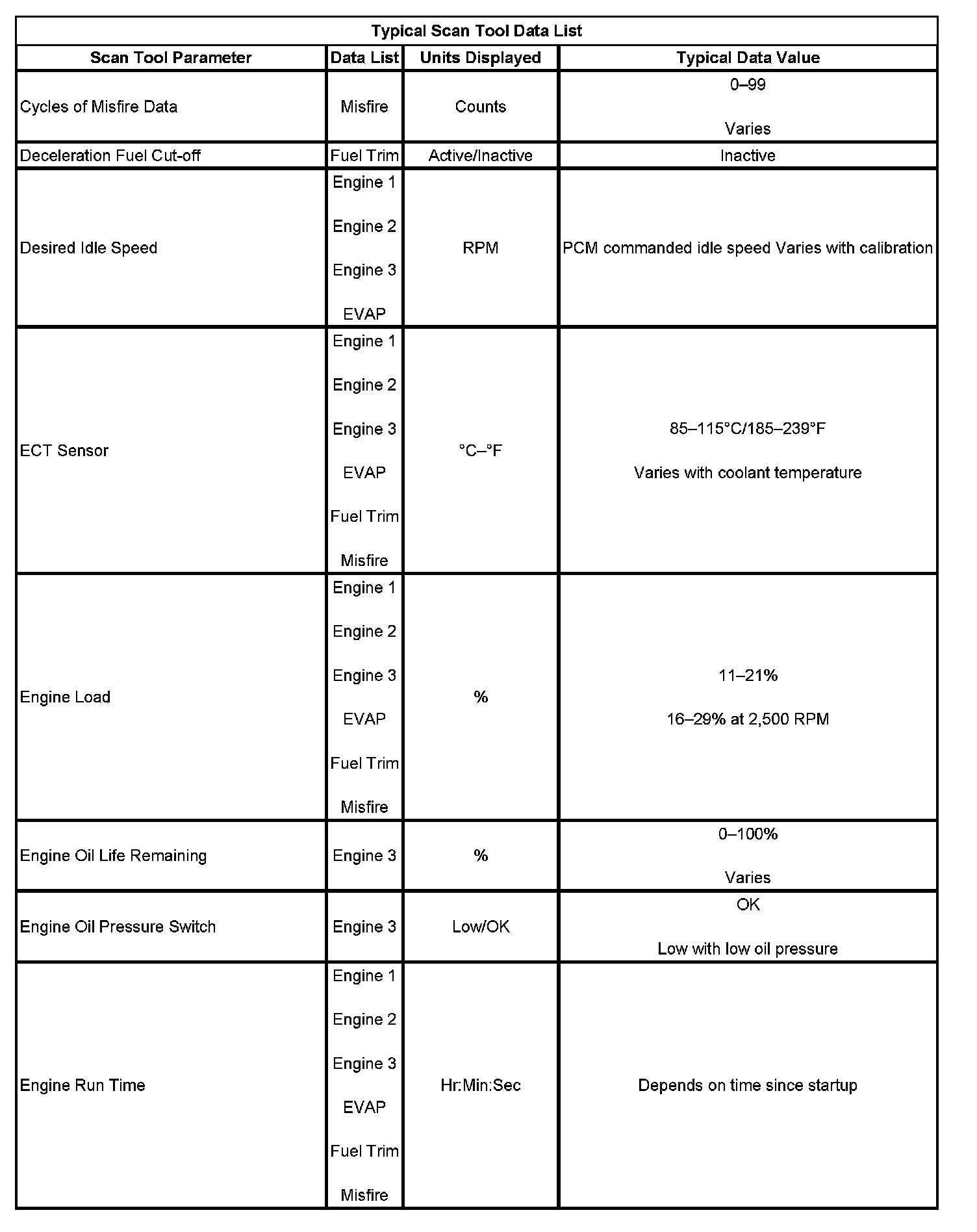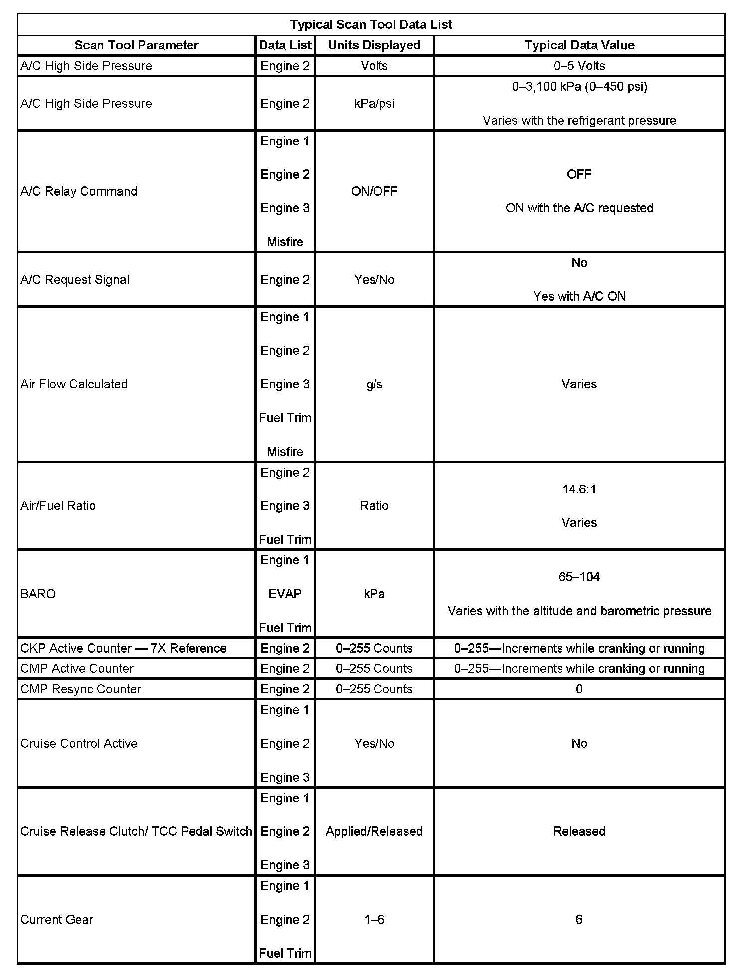 The Engine Scan Tool Data List contains all engine related parameters that are available on the scan tool. The list is arranged in alphabetical order. The parameters in the Typical Scan Data values column represent values that would be seen on a normally running engine.