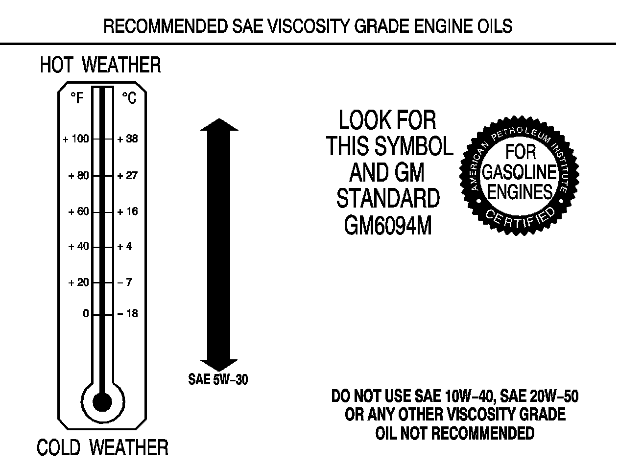 2. SAE 5W-30 as shown in the viscosity chart, SAE 5W-30 is best for your vehicle. These numbers on an oil container show its viscosity, or thickness. Do not use other viscosity oils such as SAE 20W-50. Oils meeting these requirements should also have the starburst symbol on the container. This symbol indicates that the oil has been certified by the American Petroleum Institute (API). You should look for this information on the oil container, and use only those oils that are identified as meeting GM Standard GM6094M and have the starburst symbol on the front of the oil container.