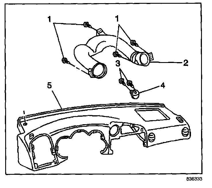 3. Remove the upper air distribution duct (2) duct from the upper IP panel (5).