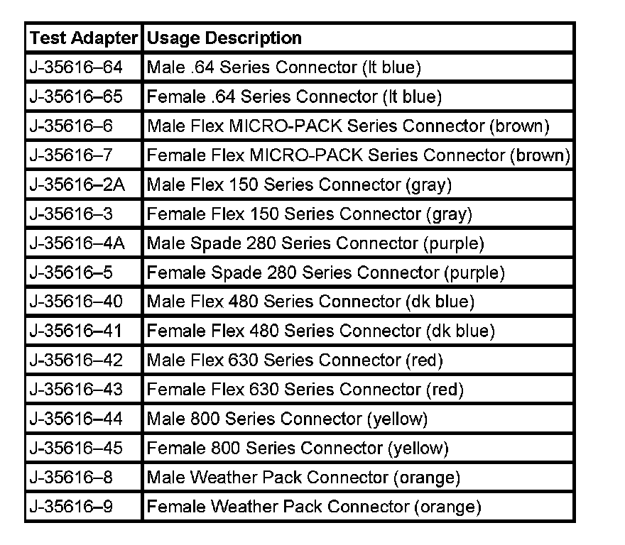 NOTE: Do not insert test equipment probes into any connector or fuse block terminal. The diameter of the test probes will deform most terminals. A deformed terminal can cause a poor connection, which can result in system failures. Always use the J 35616-B Connector Test Adapter Kit or the J 42675 Flat Wire Probe Adapter Kit in order to frontprobe terminals. Do not use paper clips or other substitutes as they can damage terminals and cause incorrect measurements.