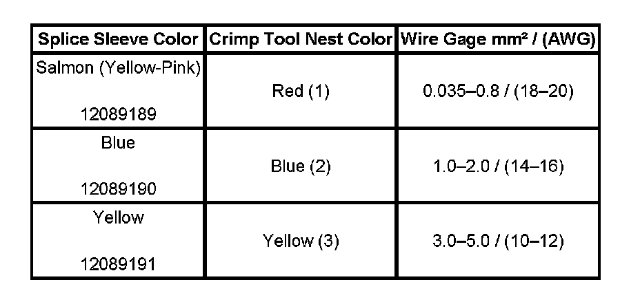 4. Select the proper duraseal splice sleeve according to the wire size. Refer to the above table at the beginning of the repair procedure for the color coding of the duraseal splice sleeves and the crimp tool nests.