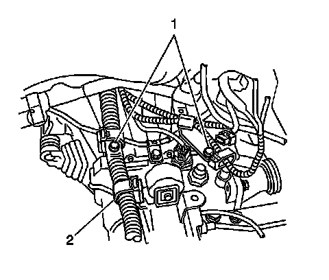 7. Remove the 2 bolts, then disconnect the 2 wire harness brackets (1).