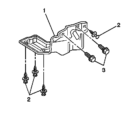 1. Install the engine splash shield (1) to the vehicle. Secure the splash shield with the 2 bolts (3) and the 4 retainers (2).