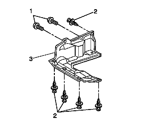 1. Install the engine splash shield (3) to the vehicle. Secure the splash shield with the 2 bolts (1) and the 5 retainers (2).