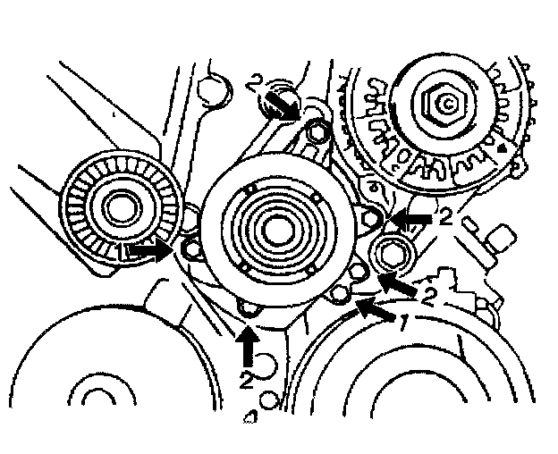 Use 6 bolts (1, 2) in order to secure the water pump
