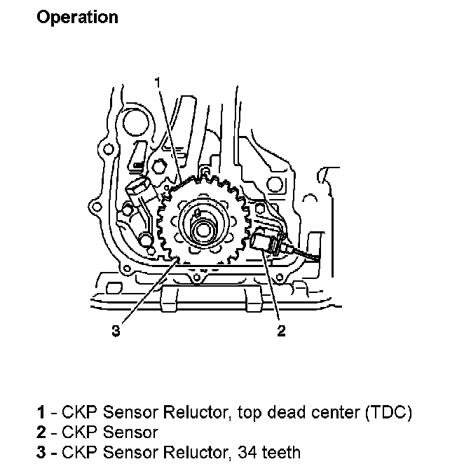 The CKP sensor reluctor (3) has 34 teeth and is mounted on the crankshaft behind the timing chain cover and the crankshaft pulley. When the crankshaft rotates, the CKP sensor signal rotor teeth pass by the CKP sensor (2) causing a fluctuation in the sensors magnetic field. The fluctuation in the magnetic field induces a voltage in the CKP sensor circuitry that corresponds to every 10 degrees of crankshaft rotation. The reluctor has one wide tooth (1) that indicates top dead center (TDC) of the number 1 cylinder. With the information that the PCM receives from the CKP sensor, the PCM determines engine speed and crankshaft position.