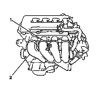 The knock sensor (KS) (1) is located below the intake manifold (2), on the engine block between cylinder 2 and cylinder 3. The KS detects engine detonation and sends a signal to the PCM. The PCM uses the input from the KS to adjust the ignition timing in order to control detonation. For detailed information on the operation of the KS refer to Knock Sensor (KS) System Description.
