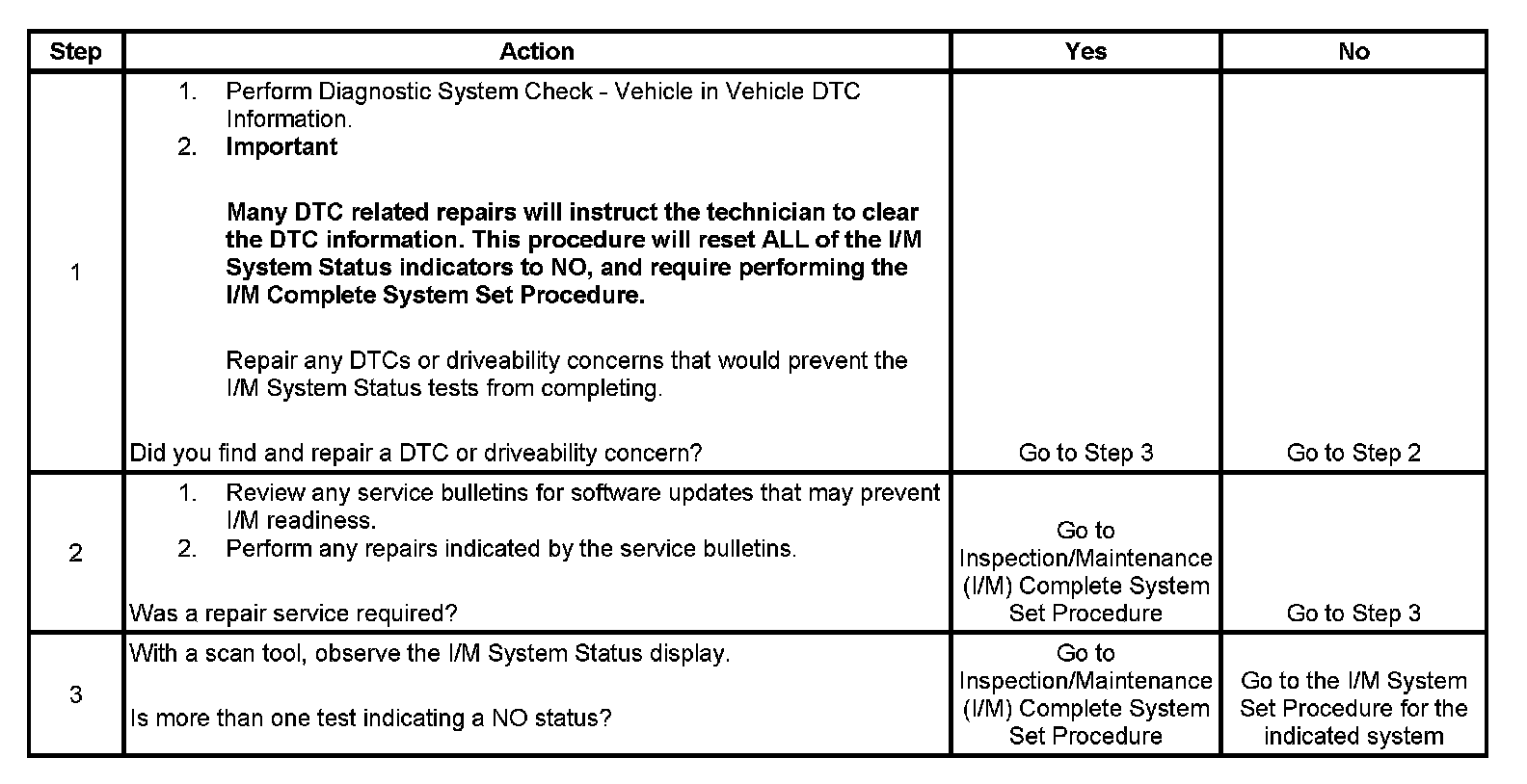 1. Any DTCs set, even those that are not listed in the Inspection/Maintenance System DTC Table, may prevent the required DTCs from running. If there is any question as to whether a set DTC is disabling the required I/M diagnostic, review the Conditions for Running in the diagnostic procedures for the DTC required by the I/M diagnostic. A list of disabling DTCs, if applicable, is contained in the supporting text for that DTC.