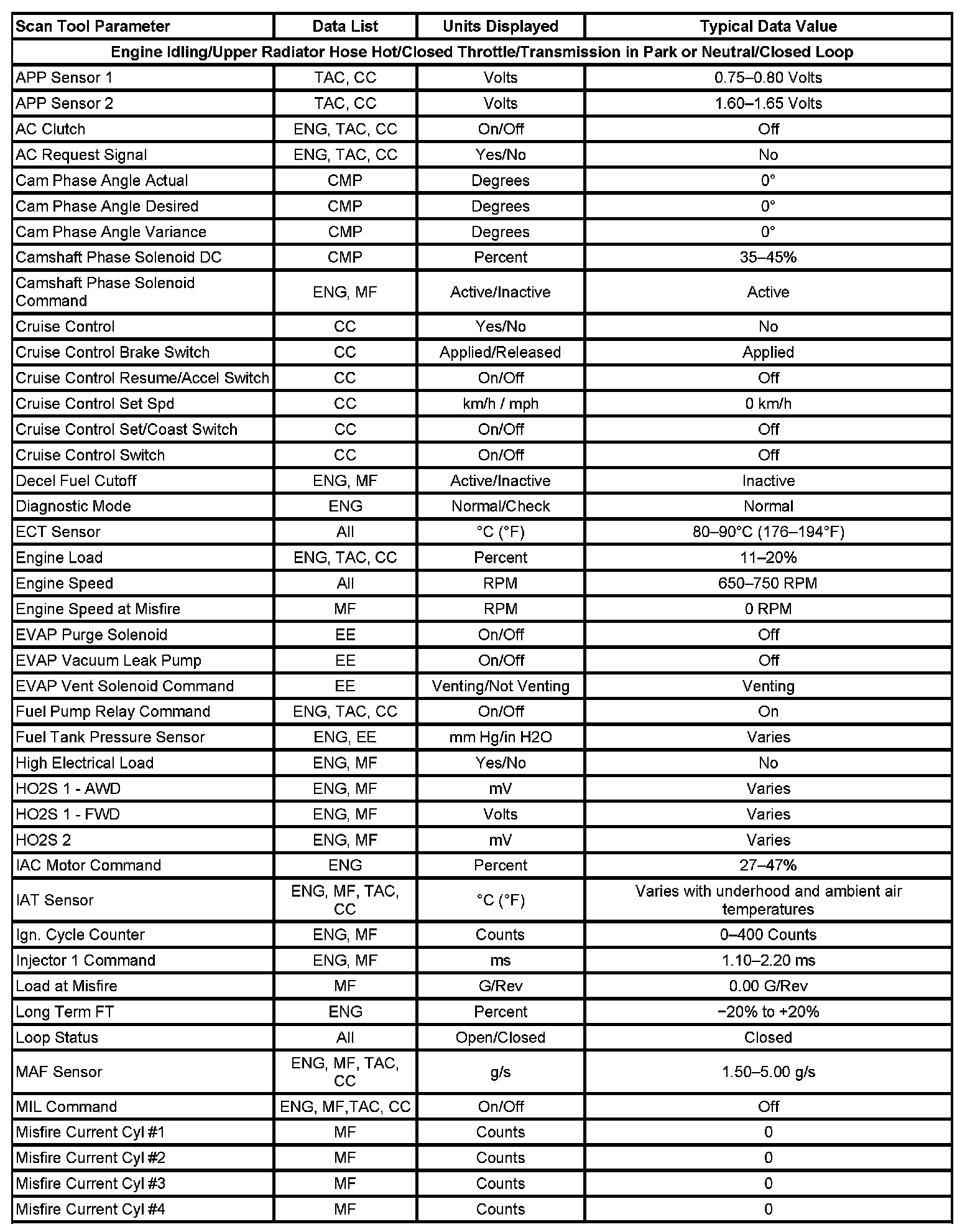 The Engine Scan Tool Data List contains all of the engine related parameters that are available on the scan tool. The list is arranged in alphabetical order.
