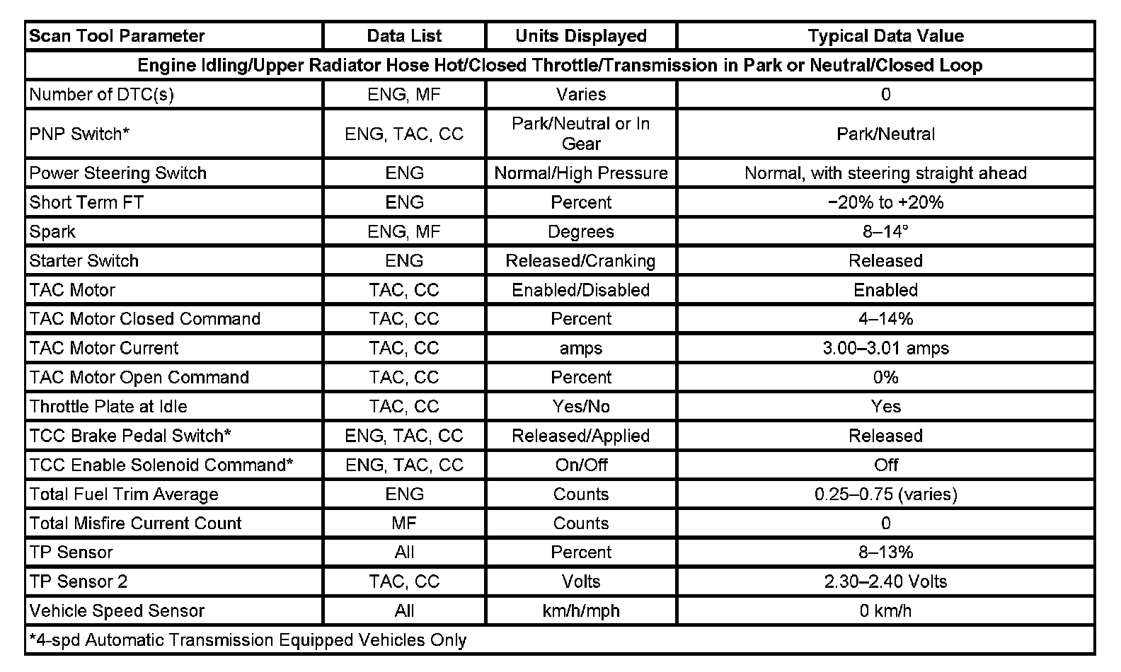 Only the parameters listed below are referenced in this Service Data for use in diagnosis. If all values are within the typical range described below, refer to Symptoms - Computers and Control Systems for diagnosis. Symptom Related Diagnostic Procedures