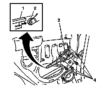 2. Slide the regulator arm roller (2) into the window bottom channel (1). Secure the regulator with 4 bolts.