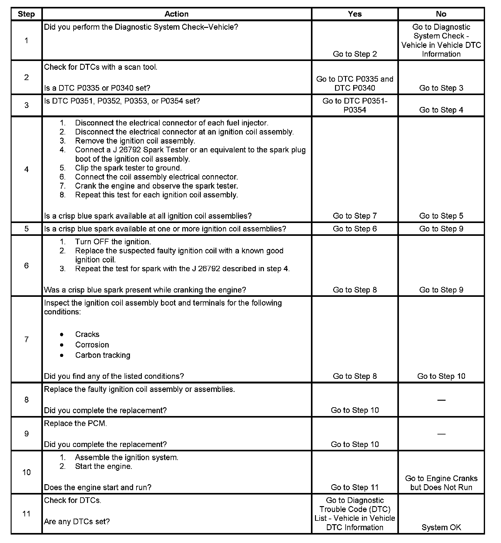 3. If there is a fault in the electrical circuits between the PCM and the ignition coil assemblies, a DTC P0351-P0354 will set. Use the DTC P0351-P0354 diagnostic table in order to repair the ignition system failure.