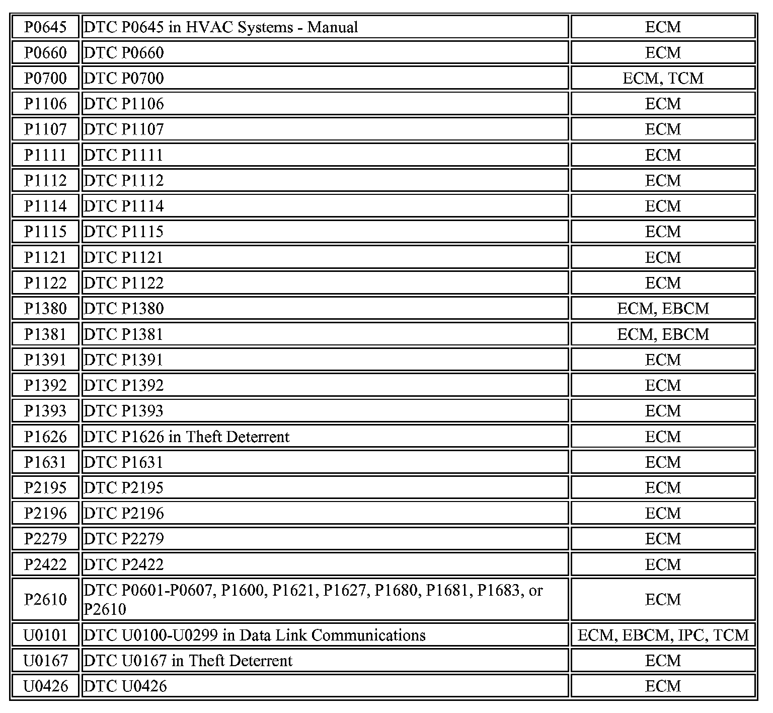 DTCs P0660 - U0426: