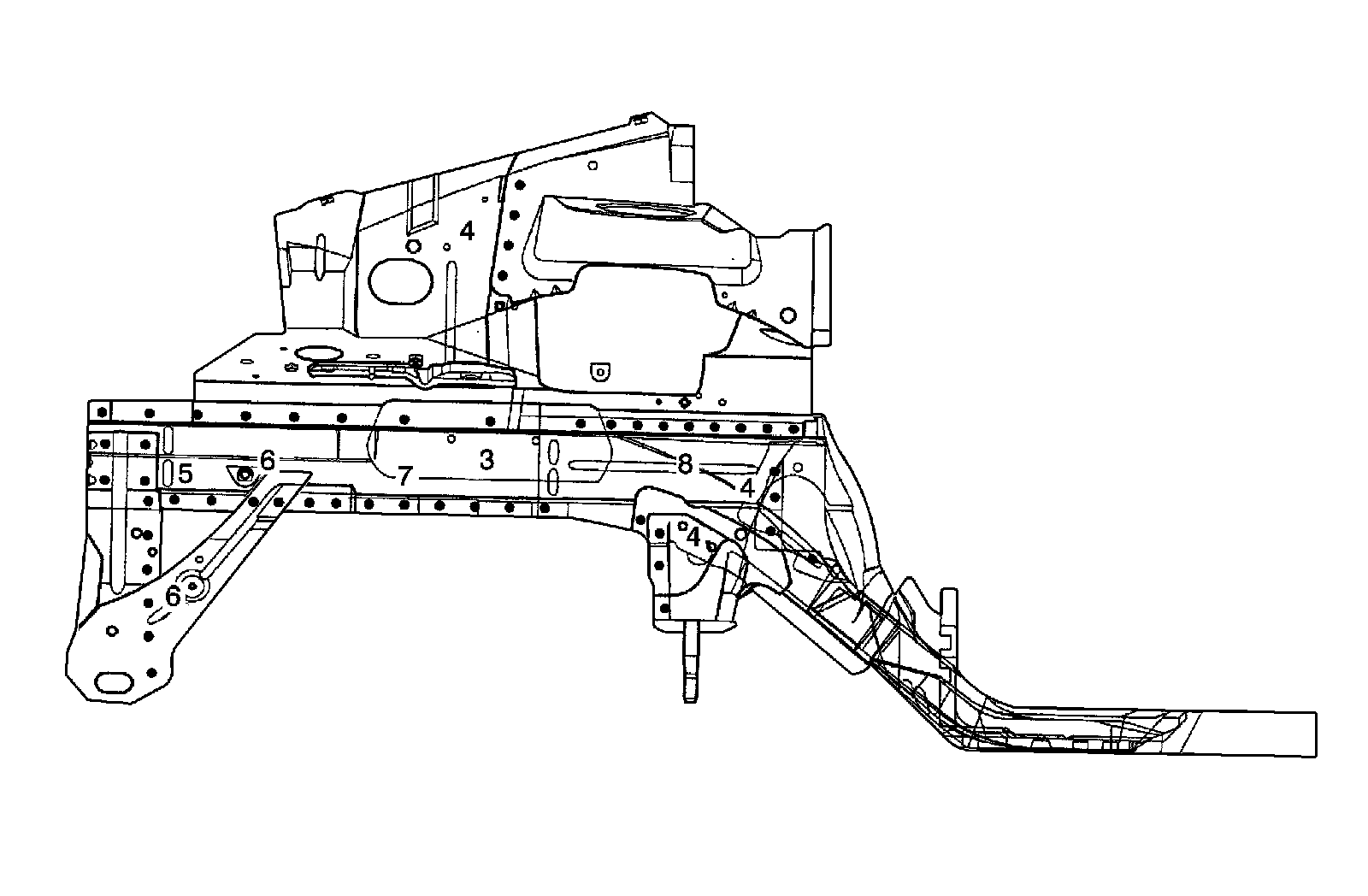 The front longitudinal is joined to the wheelhouse and front panel, it forms the base for the front suspension, engine, transmission and others. Therefore, replacement of the component affects the front wheel alignment and maintains the rigidity of the front section. When assembling it, either use a jig or follow dimensions on the body repair chart for positioning. It must be welded carefully.