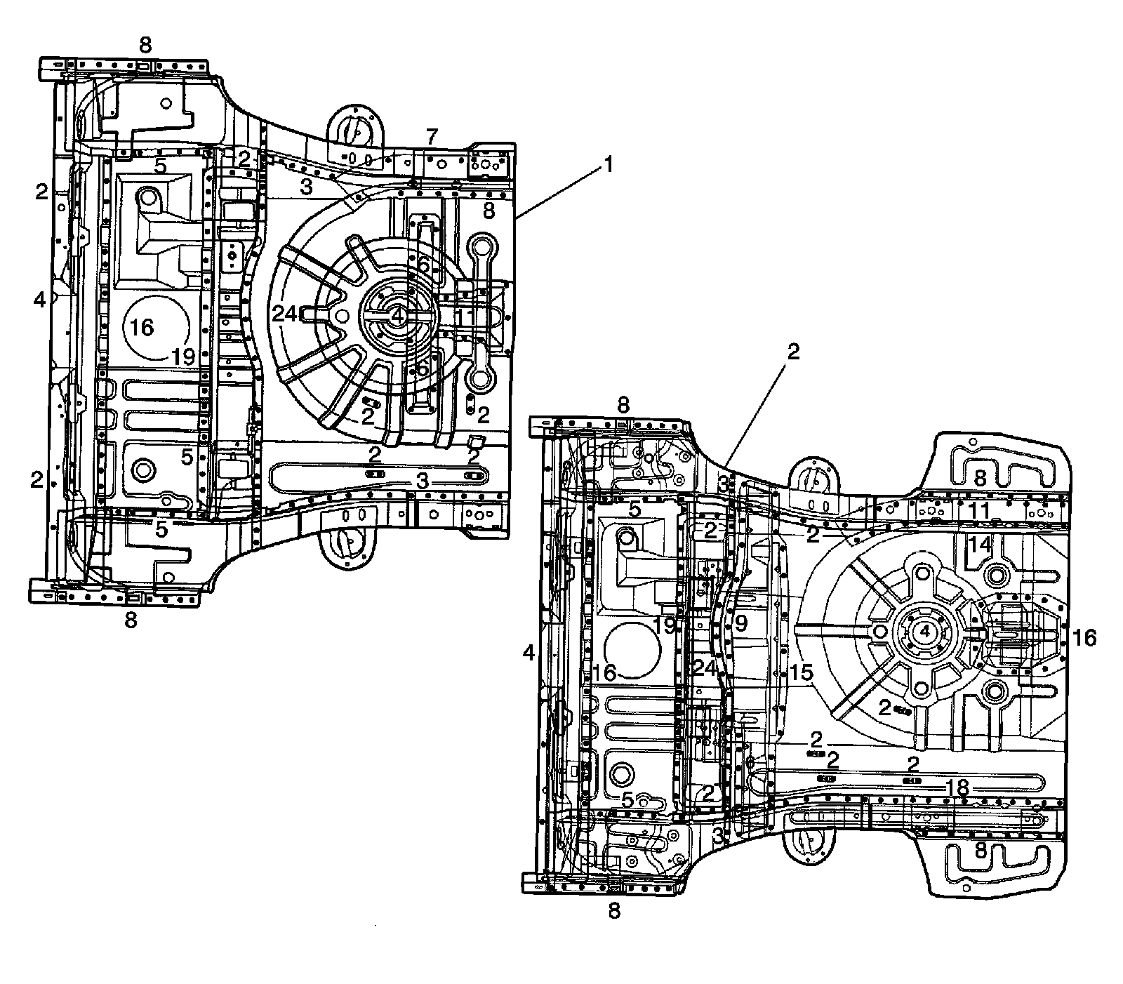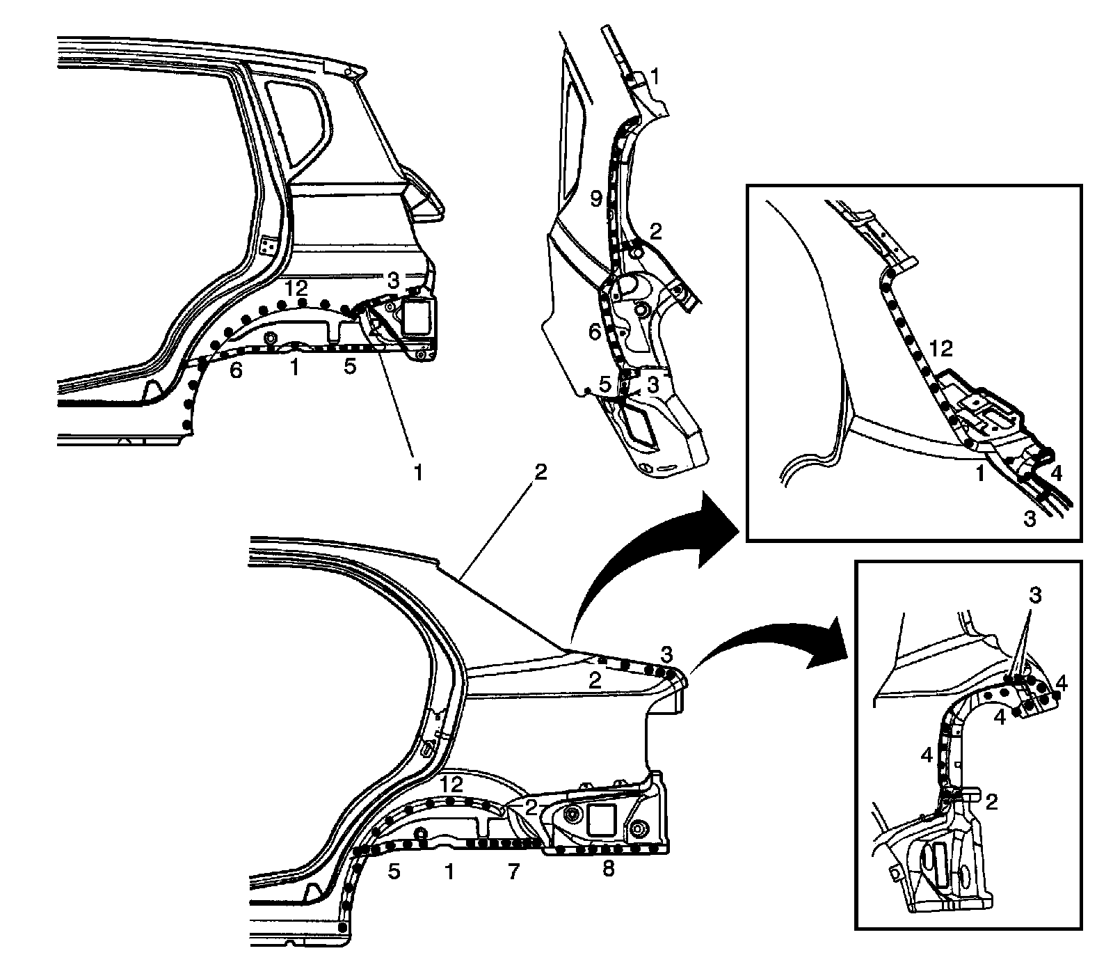 The rear floor panel is the base of the rear body and it is critical for the rigidity of the rear body. During replacement, refer to Dimensions - Body () to determine the position to set the rear floor properly.