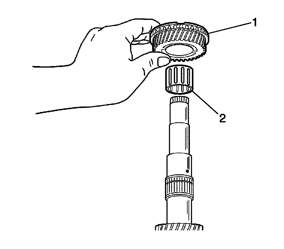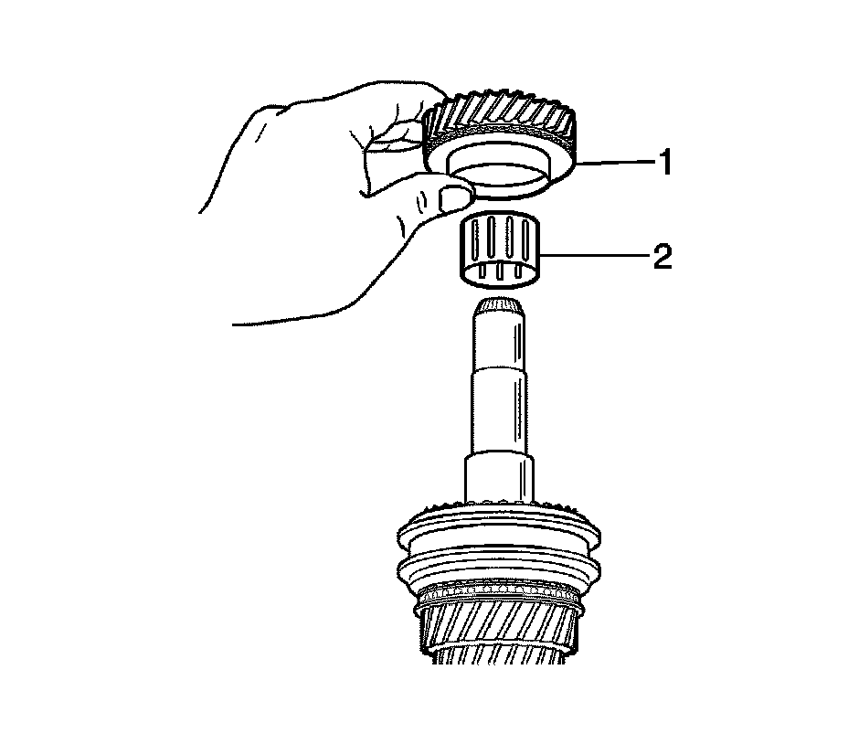 11. Install the input shaft 4th gear bearing (2) and the 4th gear (1).