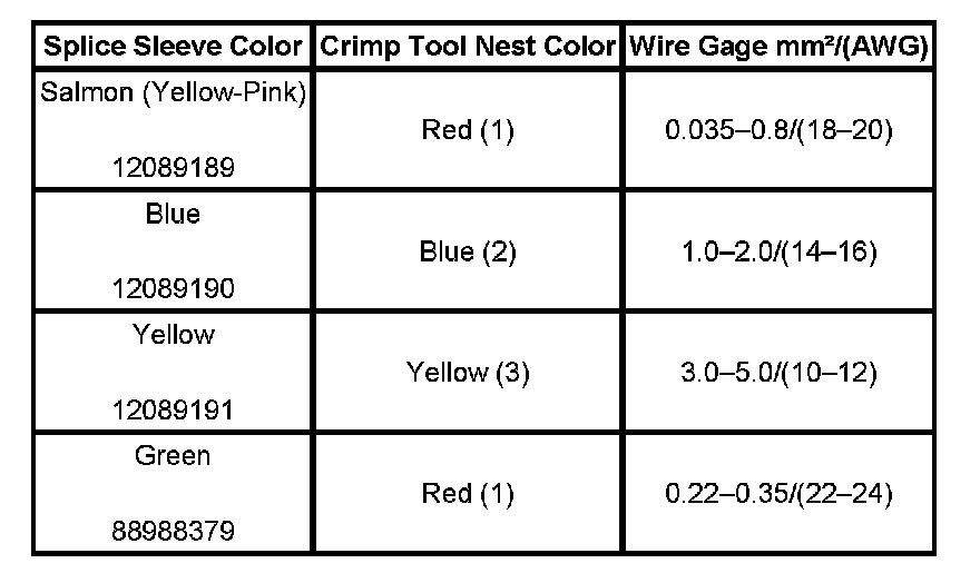 4. Select the proper duraseal splice sleeve according to the wire size. Refer to the above table at the beginning of the repair procedure for the color coding of the duraseal splice sleeves and the crimp tool nests.