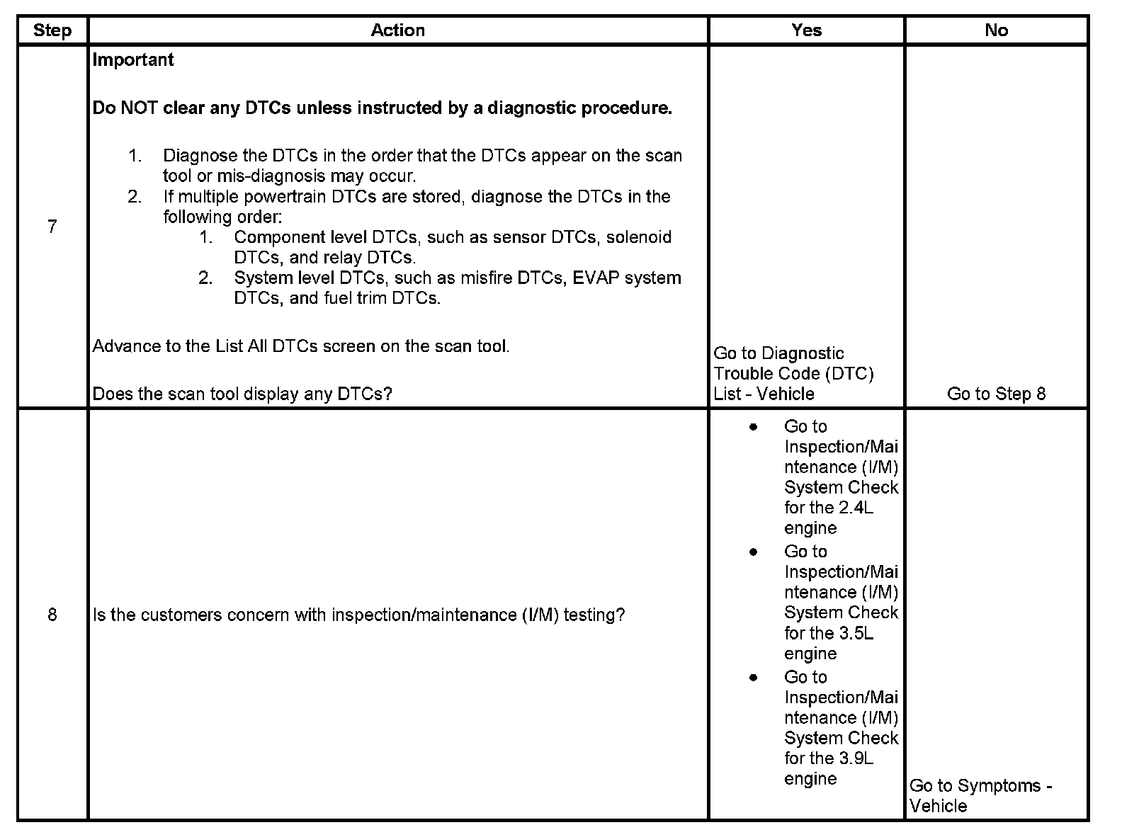 The numbers below refer to the step numbers on the diagnostic table.
