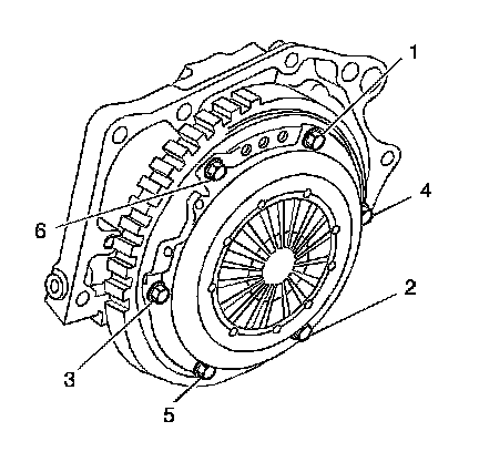 Install the clutch cover to flywheel bolts (1, 2, 3, 4, 5, 6).
