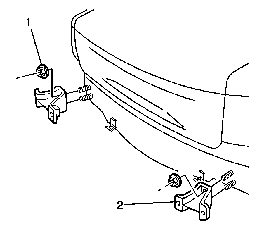 2. Remove the 2 nuts (1) attaching each of the rear bumper impact bar brackets (2) to the vehicle.