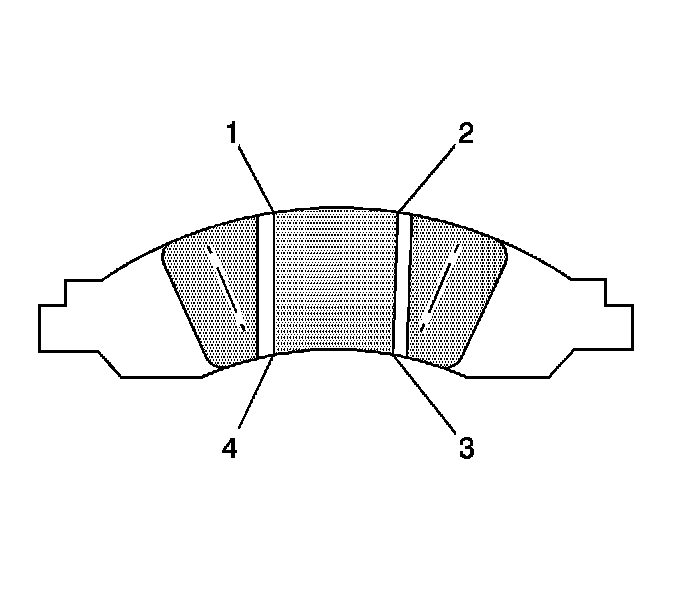 ^ Measure the thickness of the brake pad lining at the 4 locations (1,2,3,4). The lining wear should be approximately even per axle set. Replace the brake pads if the thickness of the lining is less than the specification.