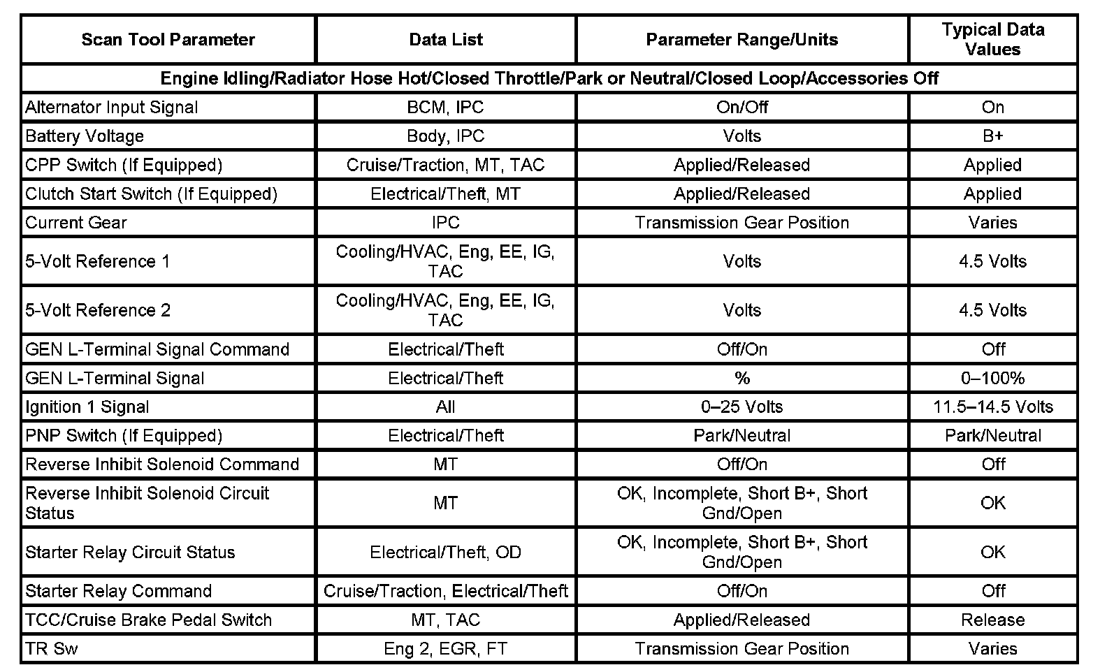 Only the parameters listed are referenced in this service data for use in diagnosis. If all values are within the typical range described below, refer to Symptoms - Starting and Charging for diagnosis. Symptom Related Diagnostic Procedures