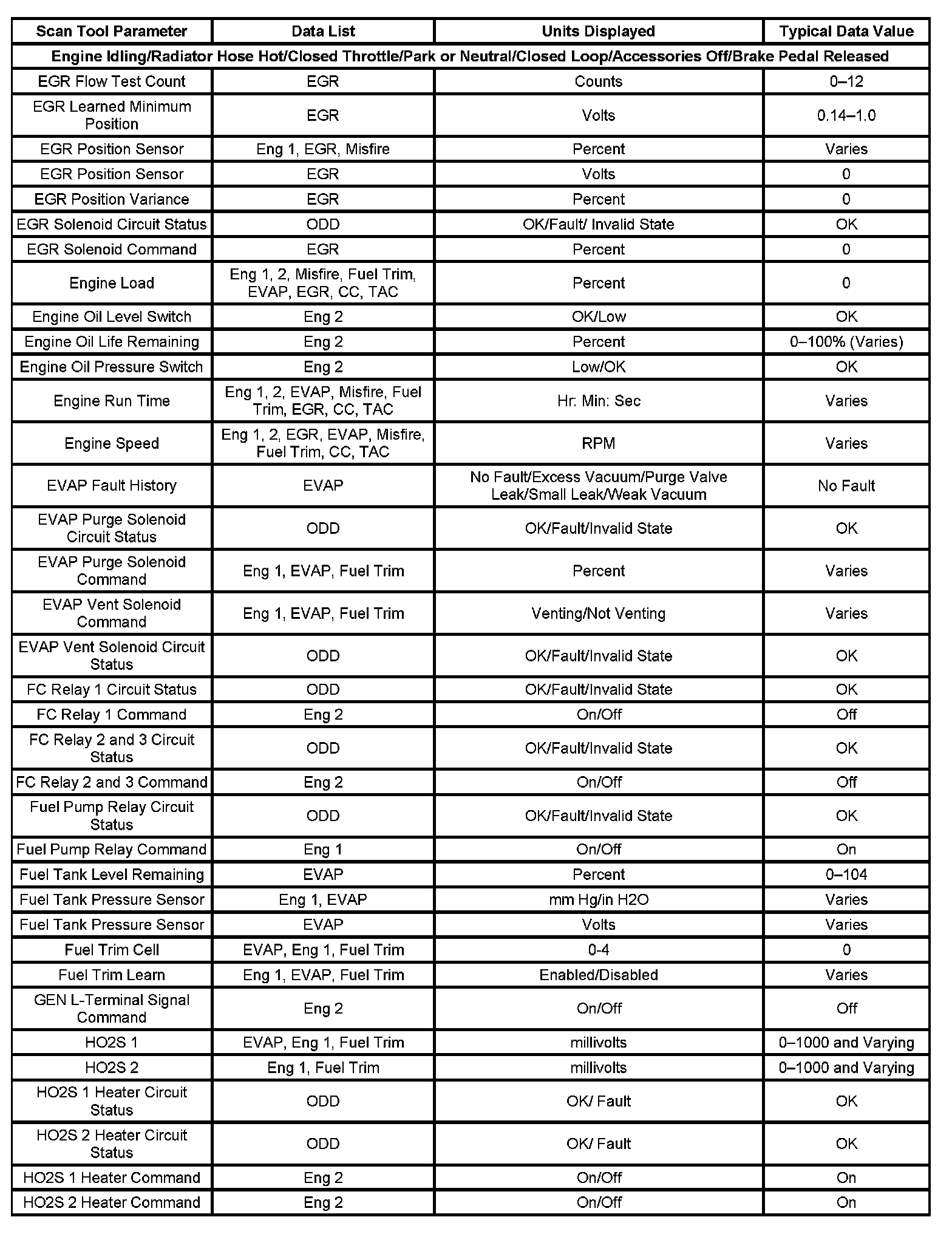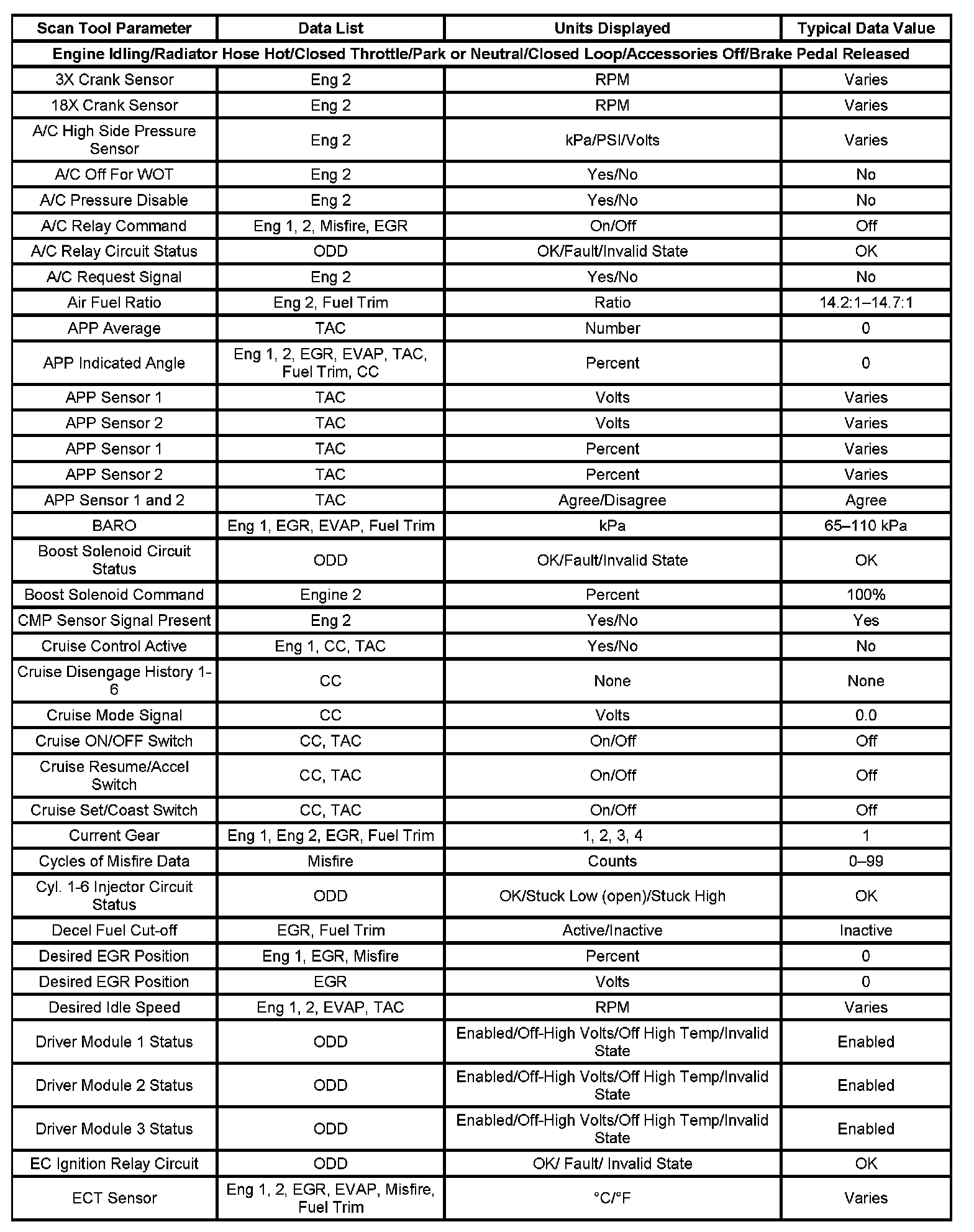 The Engine Scan Tool Data List contains all engine-related parameters that are available on the scan tool. The list is arranged in alphabetical order. A given parameter may appear in any one of the data lists, and in some cases may appear more than once, or in more than one data list in order to group certain related parameters together.