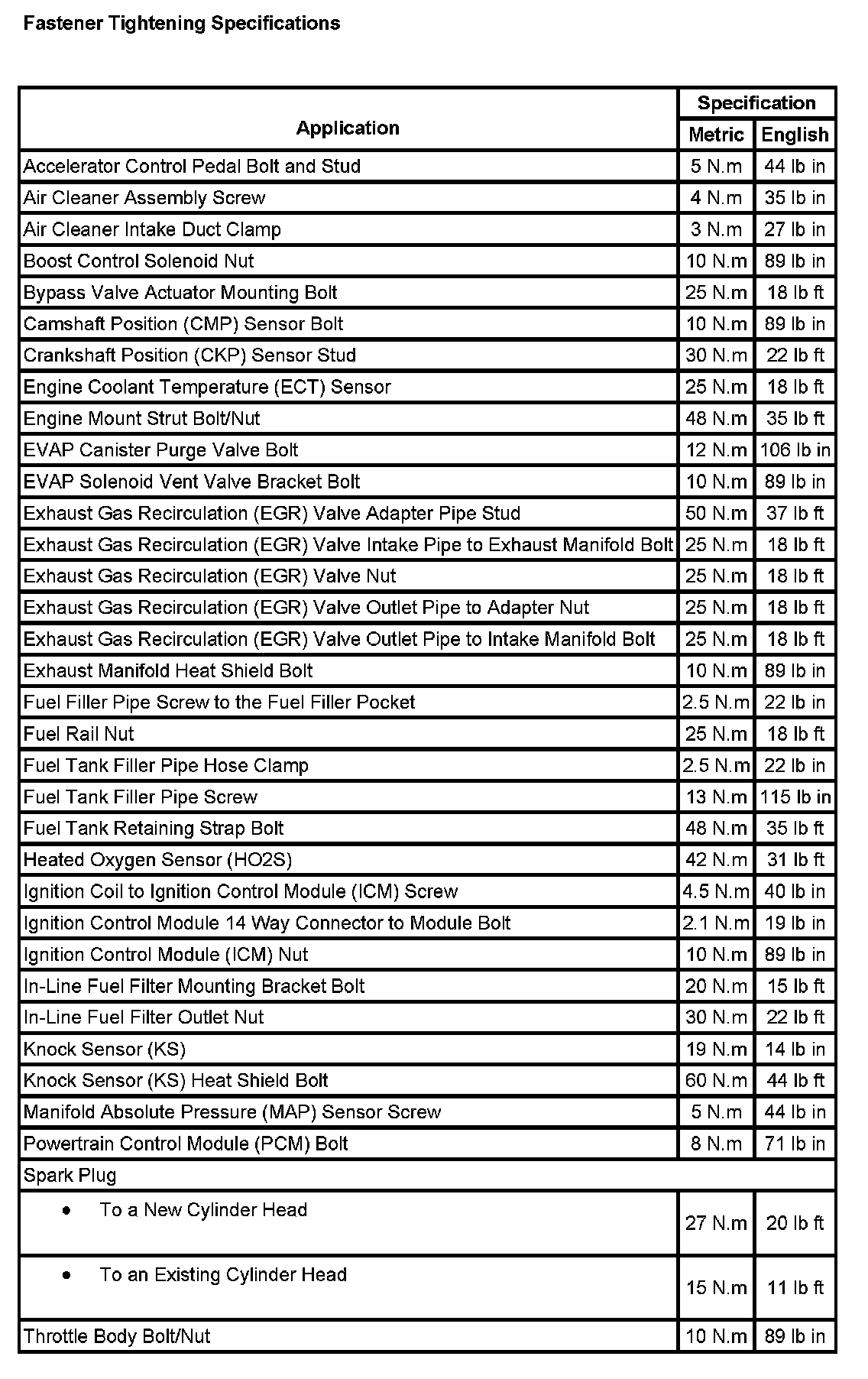 Fastener Tightening Specifications: