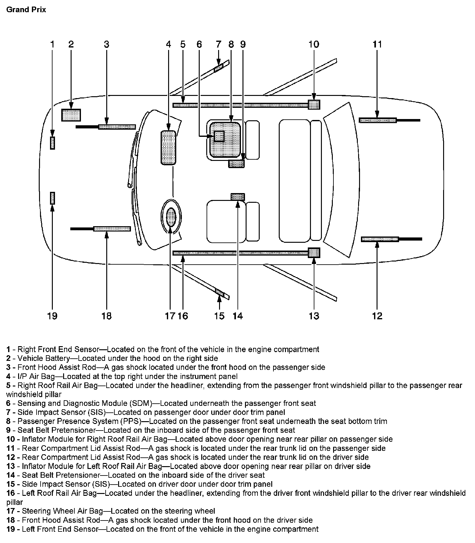 The SIR Zone Identification Views shown illustrate the approximate location of all SIR components available for the vehicle. This will assist in determining the appropriate SIR Disabling and Enabling Zones for a given service procedure, refer to SIR Disabling and Enabling Zones.