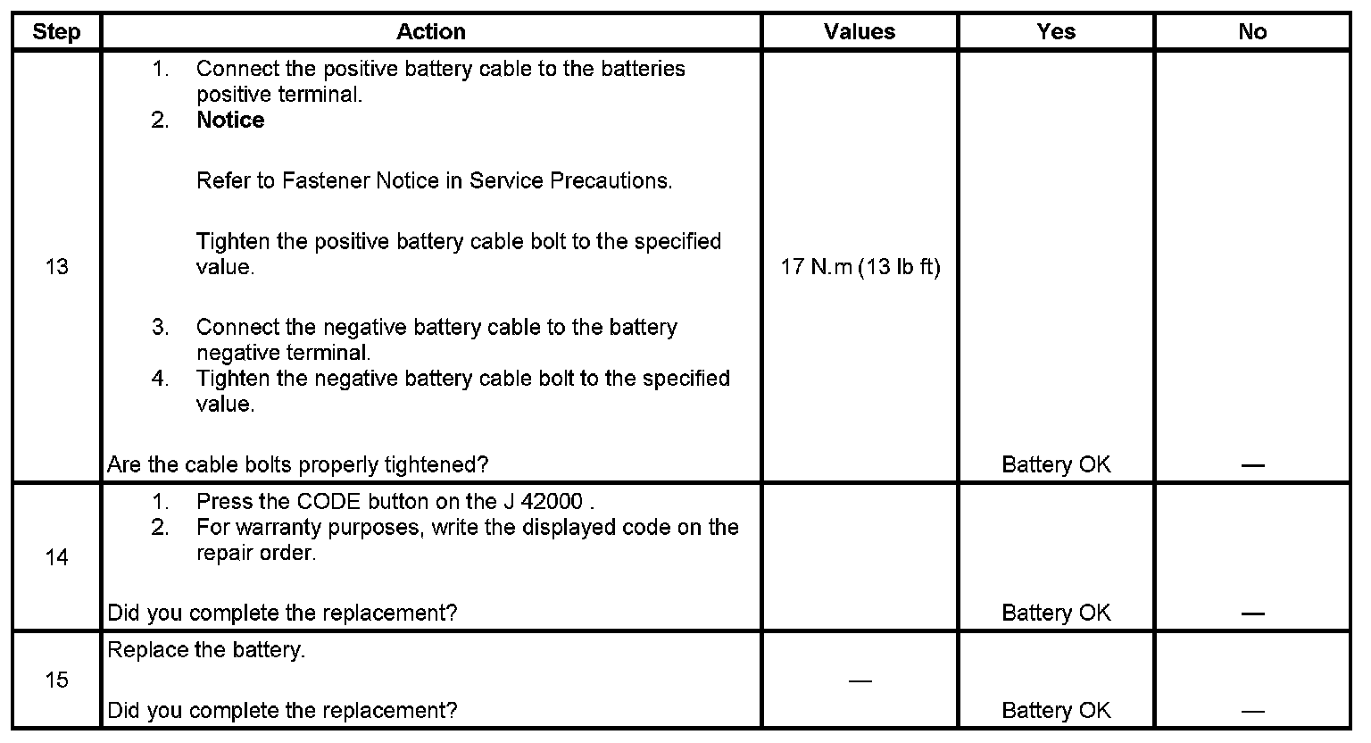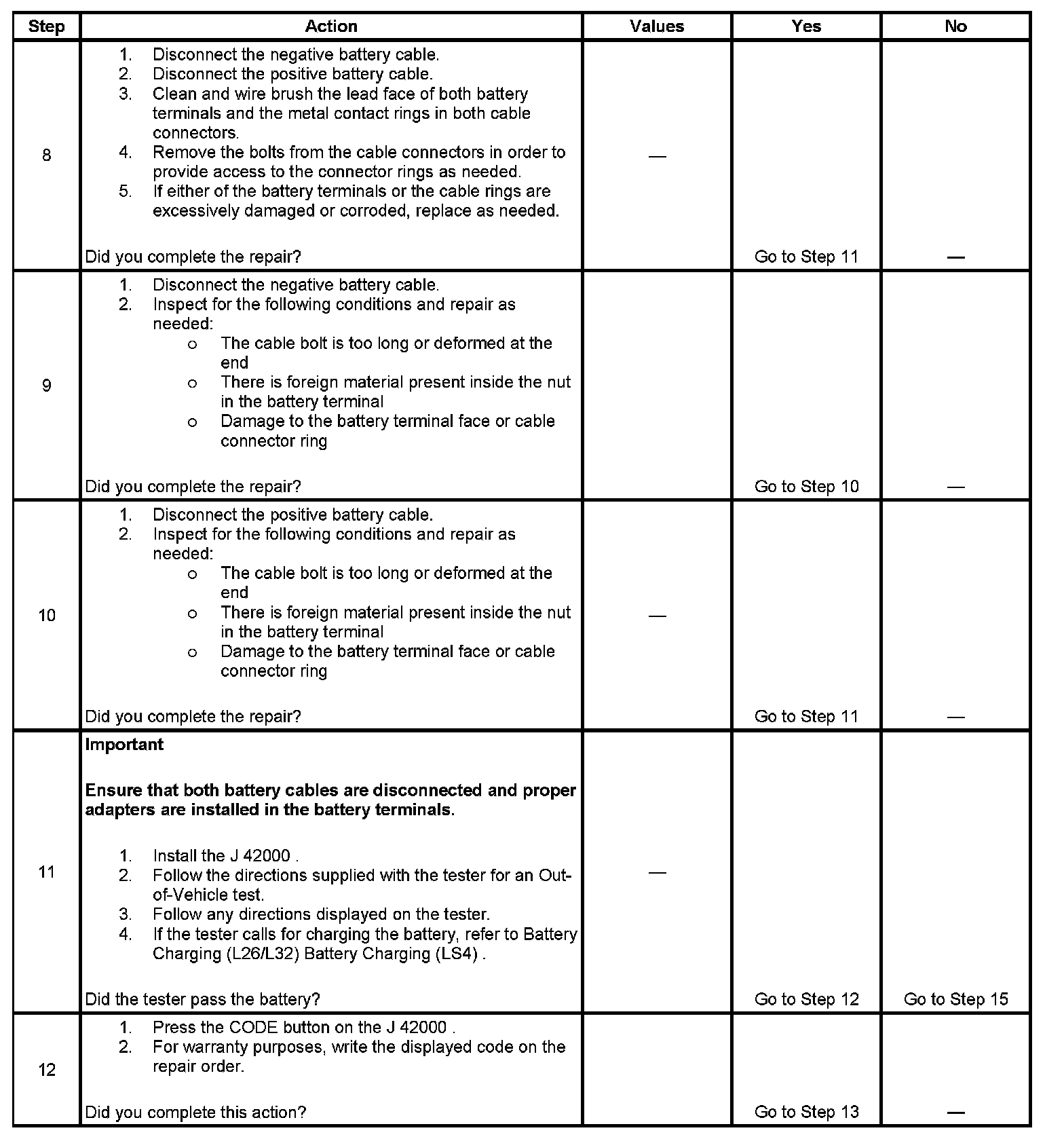 - Use the correct terminal adapters.Do not use any common bolts or a combination of bolts, nuts, and or washers as adapters when testing the battery.Use the test adapters that are provided with the J 42000 or P/N 12303040 terminal adapters. If the adapters that are provided with the J 42000 require replacement, use P/N 12303040. Any other adapter may not contact the correct areas of the battery terminal, causing a resistance that may result in an invalid battery test result.