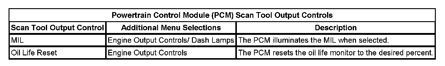 Powertrain Control Module (PCM) Scan Tool Output Controls: