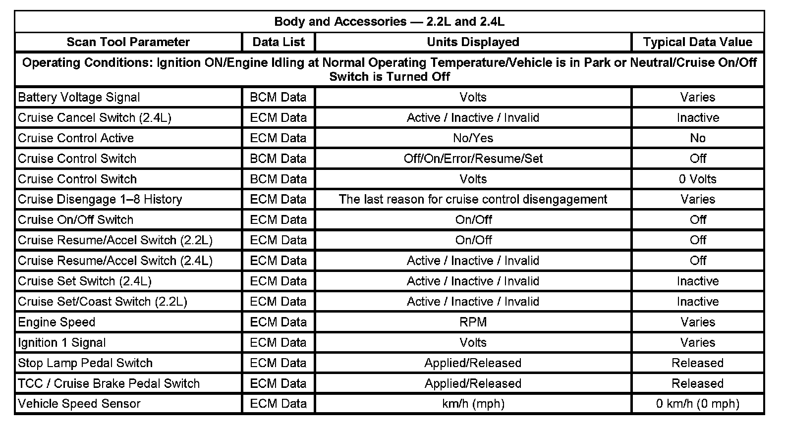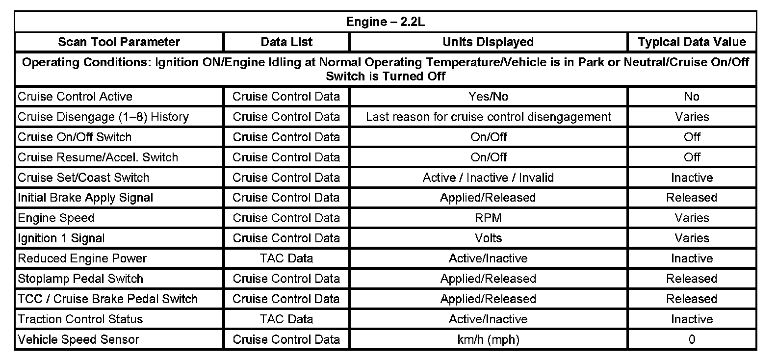 The scan tool data lists contain all of the cruise control related parameters that are available on the scan tool. The parameters in the list are arranged in alphabetical order. The data list column indicates the location of the parameter within the scan tool menu selections.