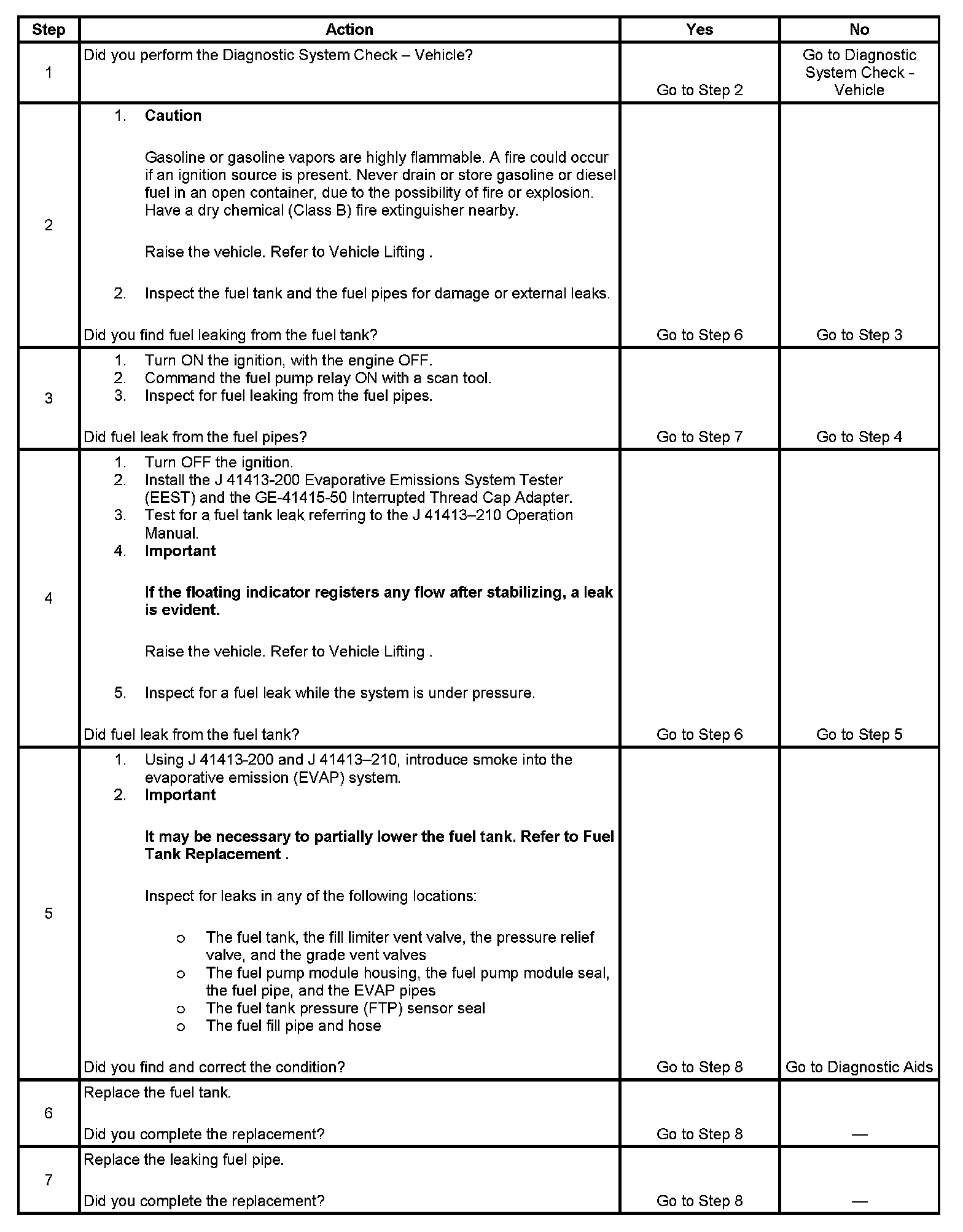 The fuel tank leak test is used to locate any fuel or fuel vapor escaping the fuel tank area. Fuel vapors escaping above the fuel level will be detected, if more than the calibrated amount, when the evaporative emission (EVAP) diagnostics complete one test cycle. The malfunction indicator lamp (MIL) will illuminate after the EVAP diagnostics have failed 2 test cycles.