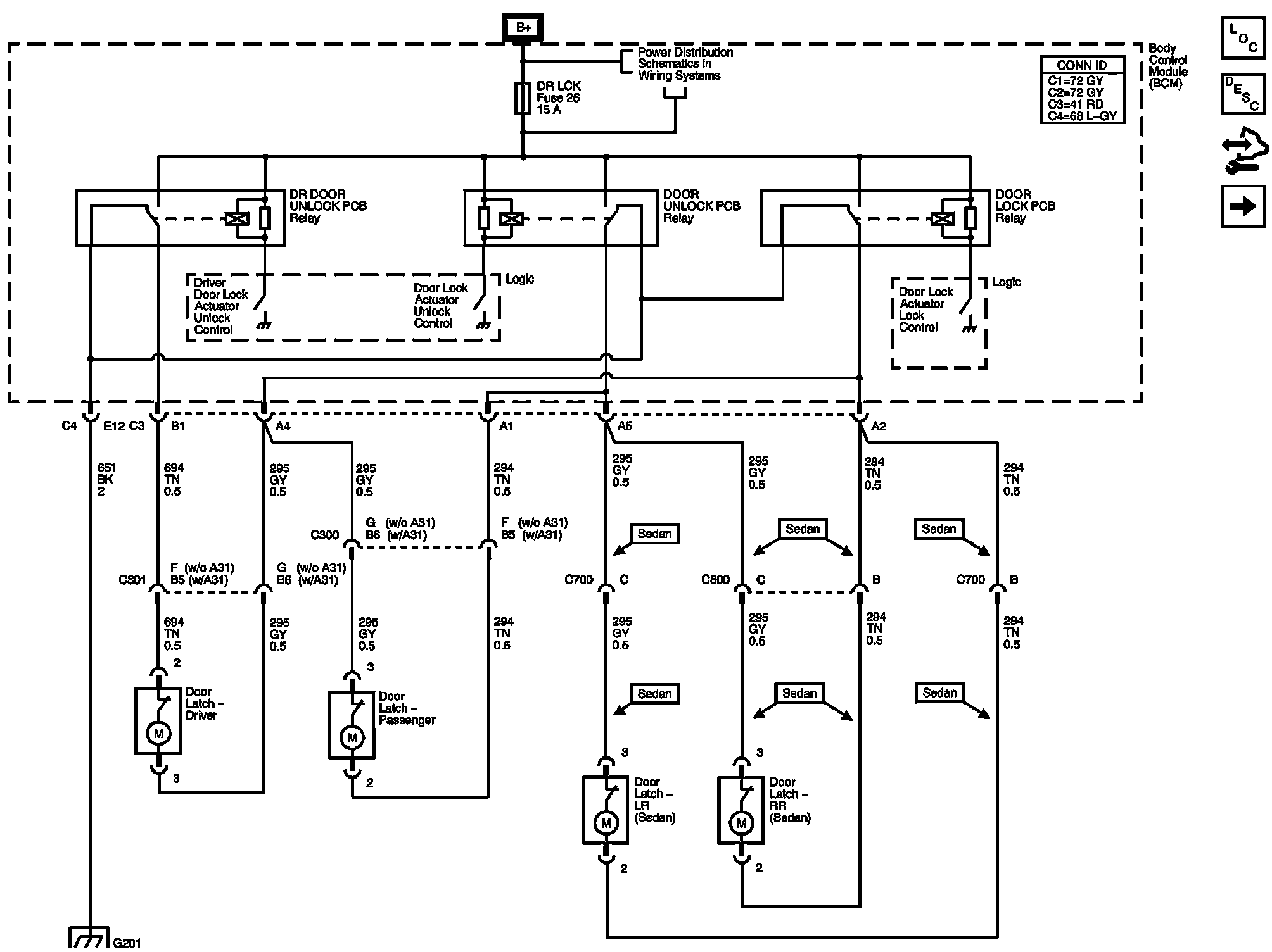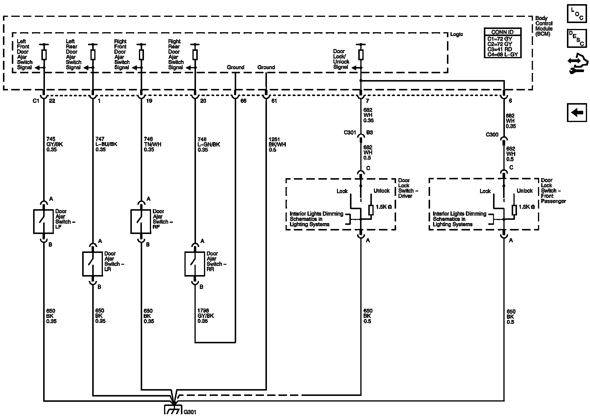 The locations for the Connectors, Grounds, Splices, and Grommets shown within these diagrams can be found via their numbers at Vehicle Locations.