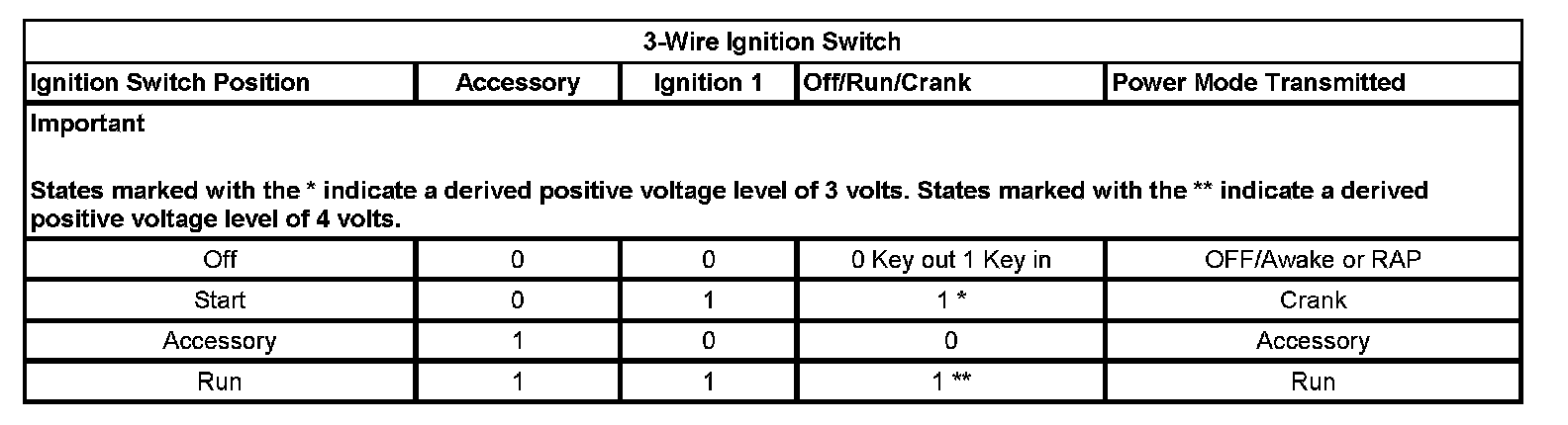 On vehicles that have several control modules connected by serial data circuits, one module is the power mode master (PMM). On this vehicle, the PMM is the body control module (BCM). The PMM receives 3 discrete ignition switch signals to differentiate which power mode will be sent over the Serial Data circuits. The 3-wire Ignition Switch table illustrates the state of these inputs in correspondence to the ignition switch position.
