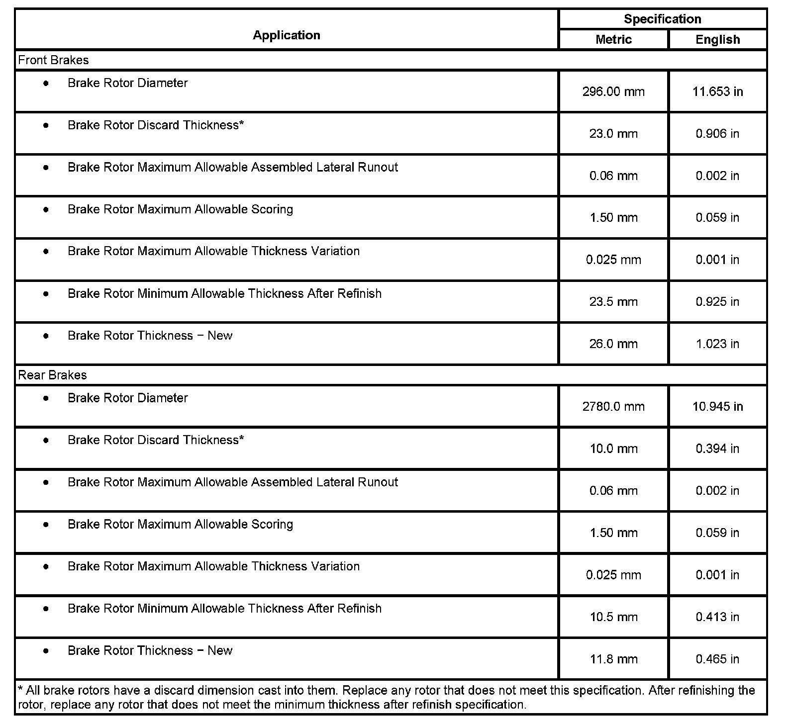 Disc Brake Component Specifications: