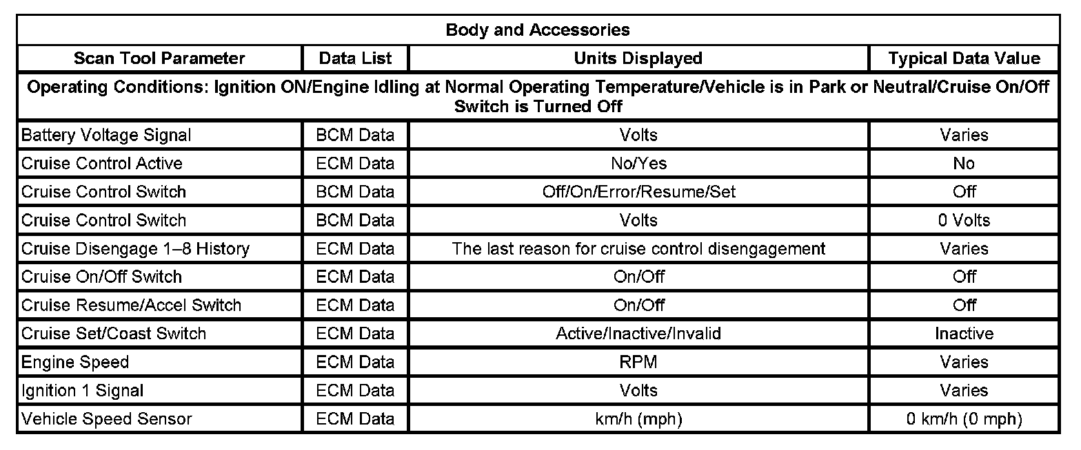 The scan tool data lists contain all of the cruise control related parameters that are available on the scan tool. The parameters in the list are arranged in alphabetical order. The data list column indicates the location of the parameter within the scan tool menu selections.
