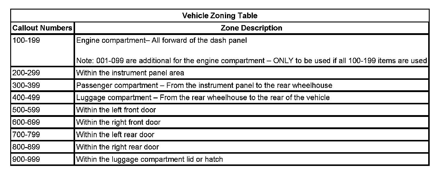 All grounds, in-line connectors, pass-through grommets, and splices have identifying numbers that correspond to where they are located in the vehicle. The table explains the numbering system.