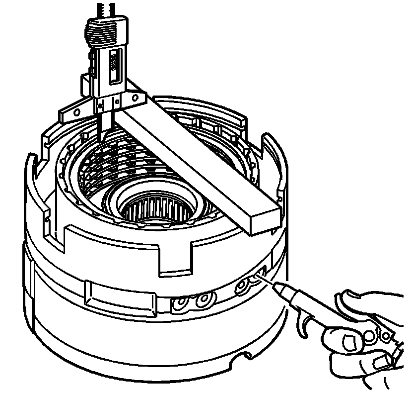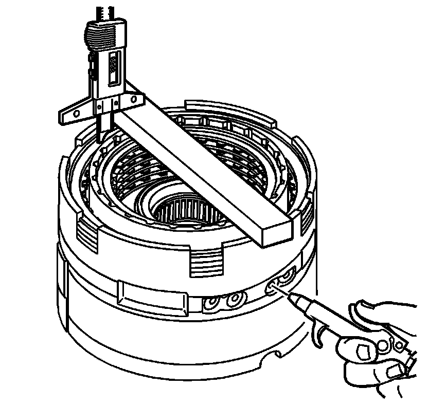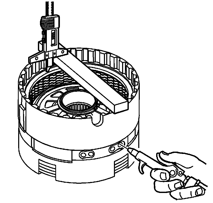 13. Apply 65 PSI (448.17 kPa) of air pressure to the specified port. Measure the distance between the 2nd clutch backing plate and the bottom of the gage bar. Measure three times in different locations on the backing plate. Record this as H2.