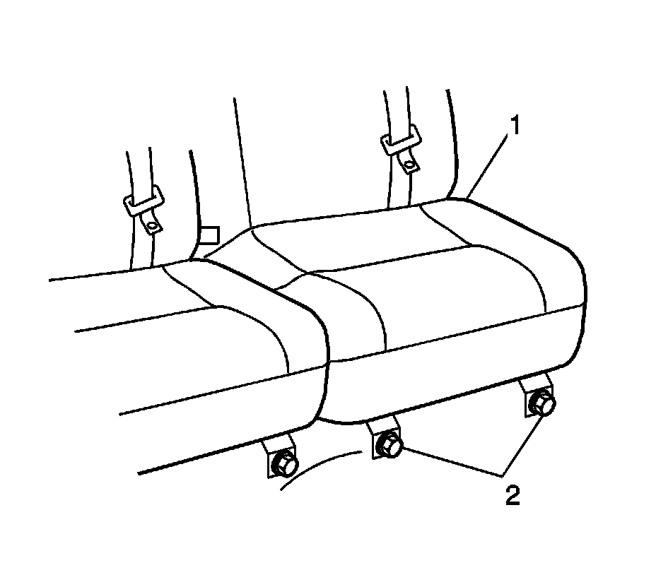 2. Remove the two fasteners (2) and swing the left rear seat bottom cushion (1) up and out of the way.