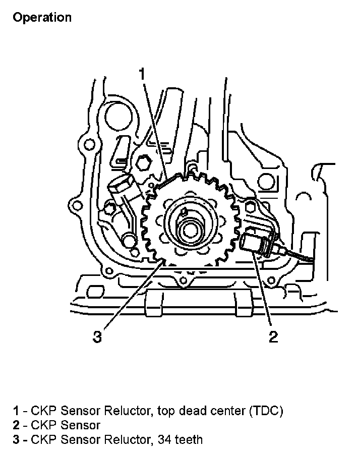 The CKP sensor reluctor (3) has 34 teeth and is mounted on the crankshaft behind the timing chain cover and the crankshaft pulley. When the crankshaft rotates, the CKP sensor signal rotor teeth pass by the CKP sensor (2) causing a fluctuation in the sensors magnetic field. The fluctuation in the magnetic field induces a voltage in the CKP sensor circuitry that corresponds to every 10 degrees of crankshaft rotation. The reluctor has one wide tooth (1) that indicates top dead center (TDC) of the number 1 cylinder. With the information that the PCM receives from the CKP sensor, the PCM determines engine speed and crankshaft position.