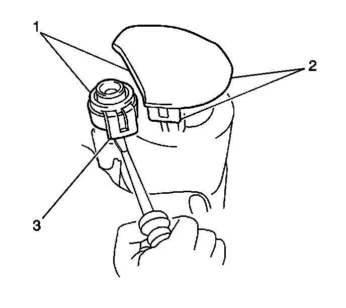 8. Use a screwdriver with a tape protected end (3) in order to release the 5 lock tabs (1, 2) the fuel pump strainer assembly.
