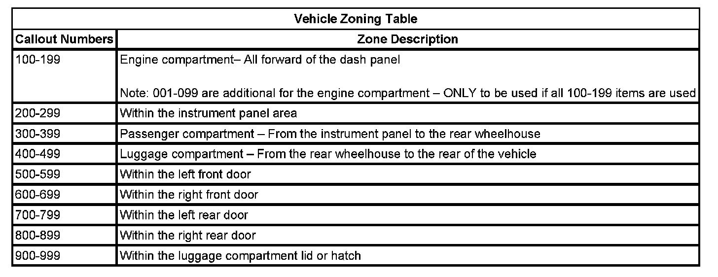 All grounds, in-line connectors, pass-through grommets, and splices have identifying numbers that correspond to where they are located in the vehicle. The following table explains the numbering system.