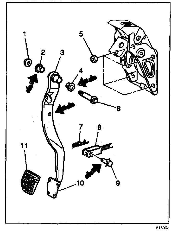 4. Install the pedal and the shaft bolt (6) to the bracket.