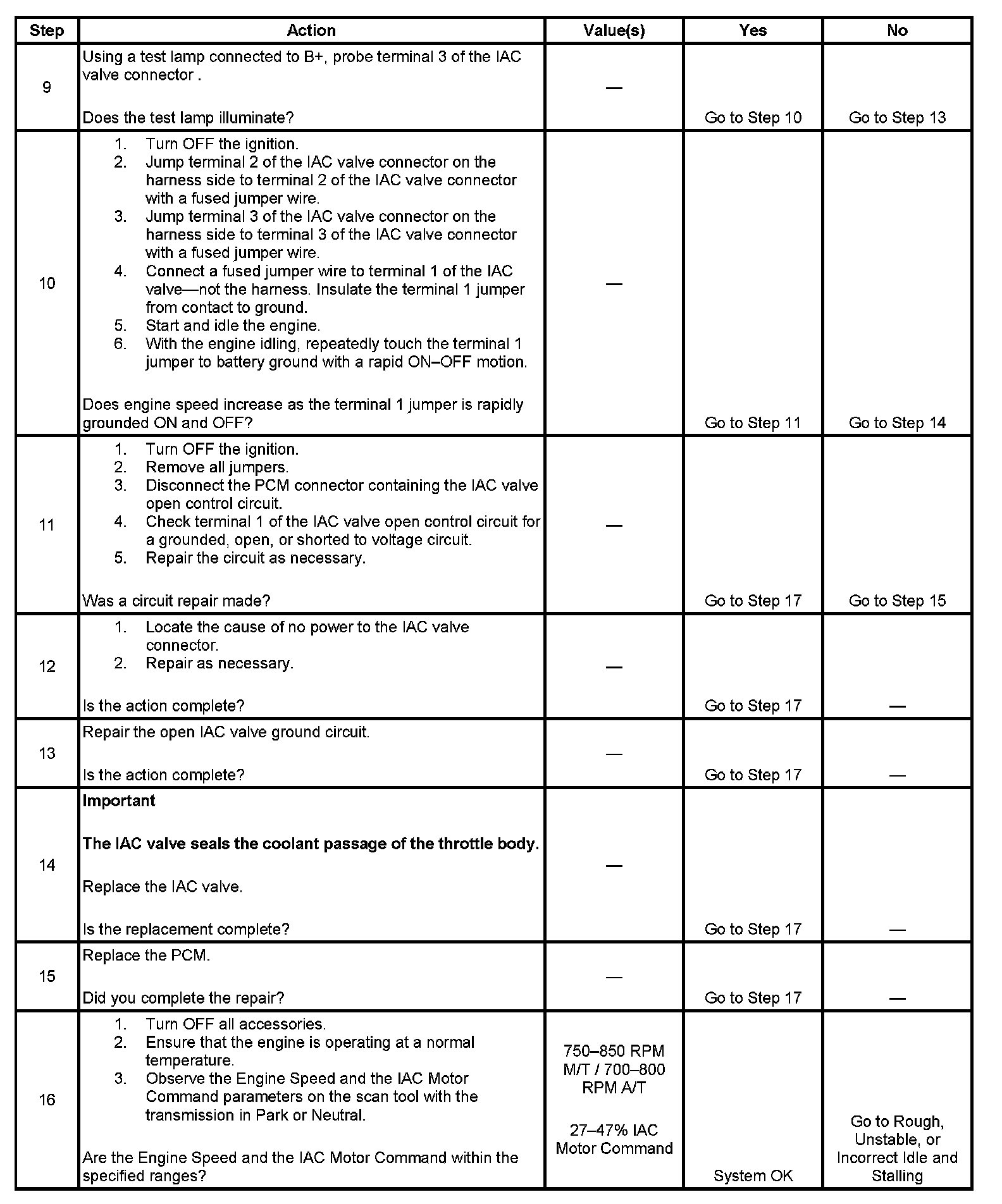 4. This step tests whether the PCM can operate the IAC valve with the scan tool. The IAC valve can be commanded to increase and/or decrease engine speed by using the scan tool RPM Control function. Remember to clear any DTCs and run the engine until the engine reaches a normal operating temperature before attempting RPM Control with the scan tool.