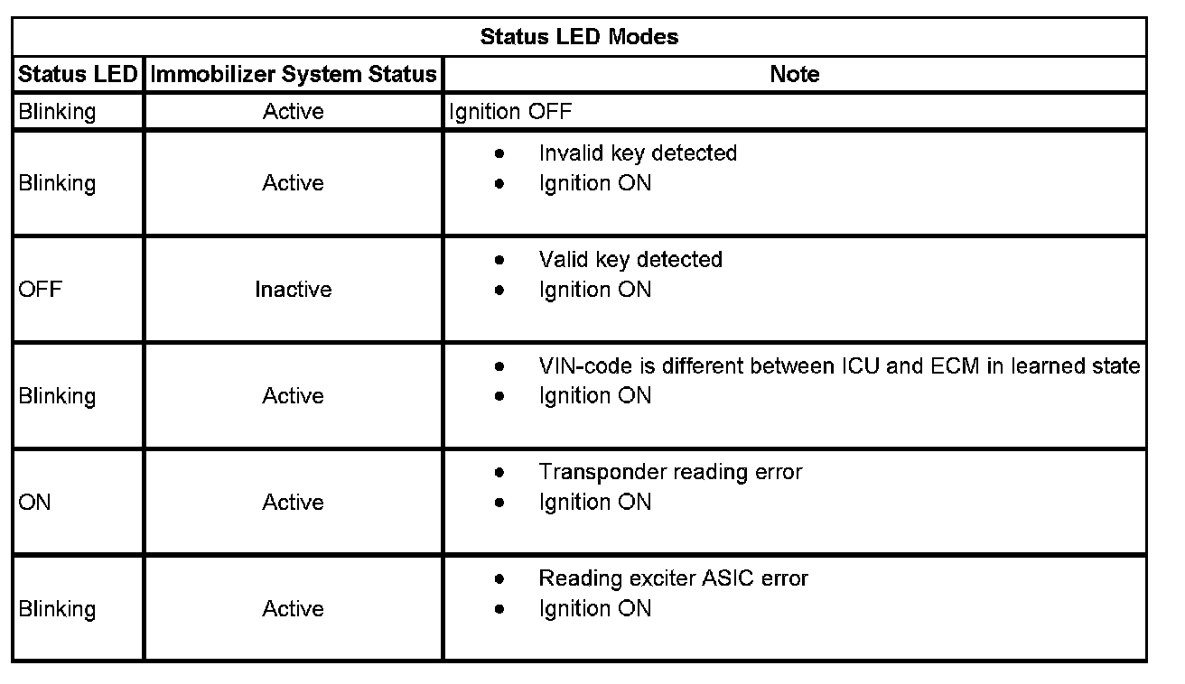 The immobilizer system design prevents vehicle theft by interrupting the engine operation. The immobilizer system prevents the vehicle from starting. The engine operating functions interrupt if the immobilizer system does not recognize the transponder identification code of the ignition key. The immobilizer system and the content theft deterrent system do not interact. The system includes the following components: