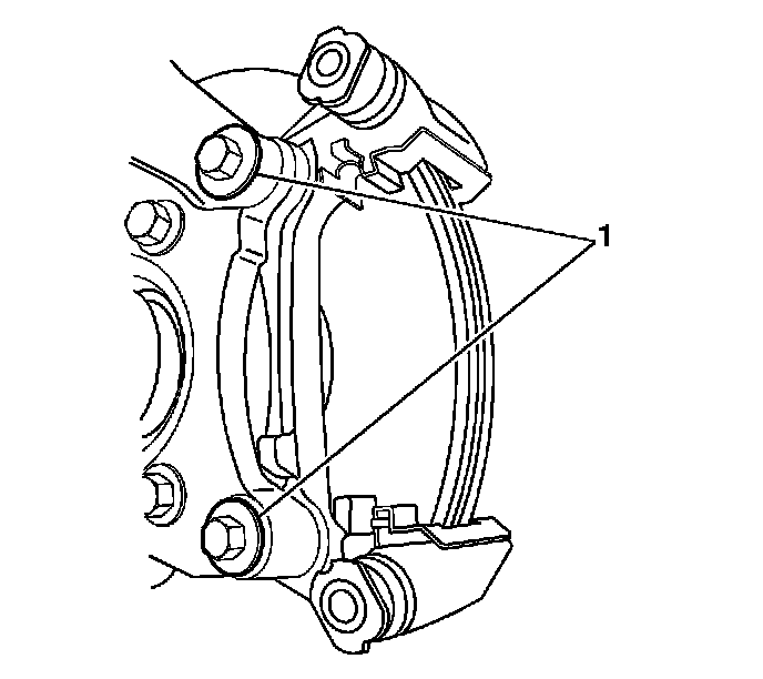 7. Remove the brake caliper mounting bracket bolts (1).